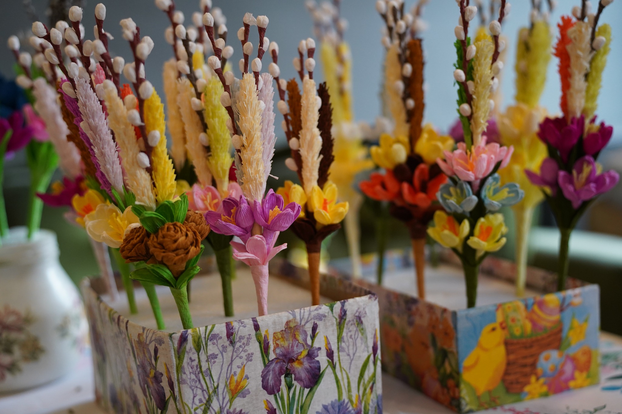 Zdjęcie przedstawia kilkanaście delikatnych papierowych palemek, starannie umieszczonych w kolorowych pudełkach ozdobionych świątecznymi, wielkanocnymi motywami, tworząc świąteczną kompozycję.