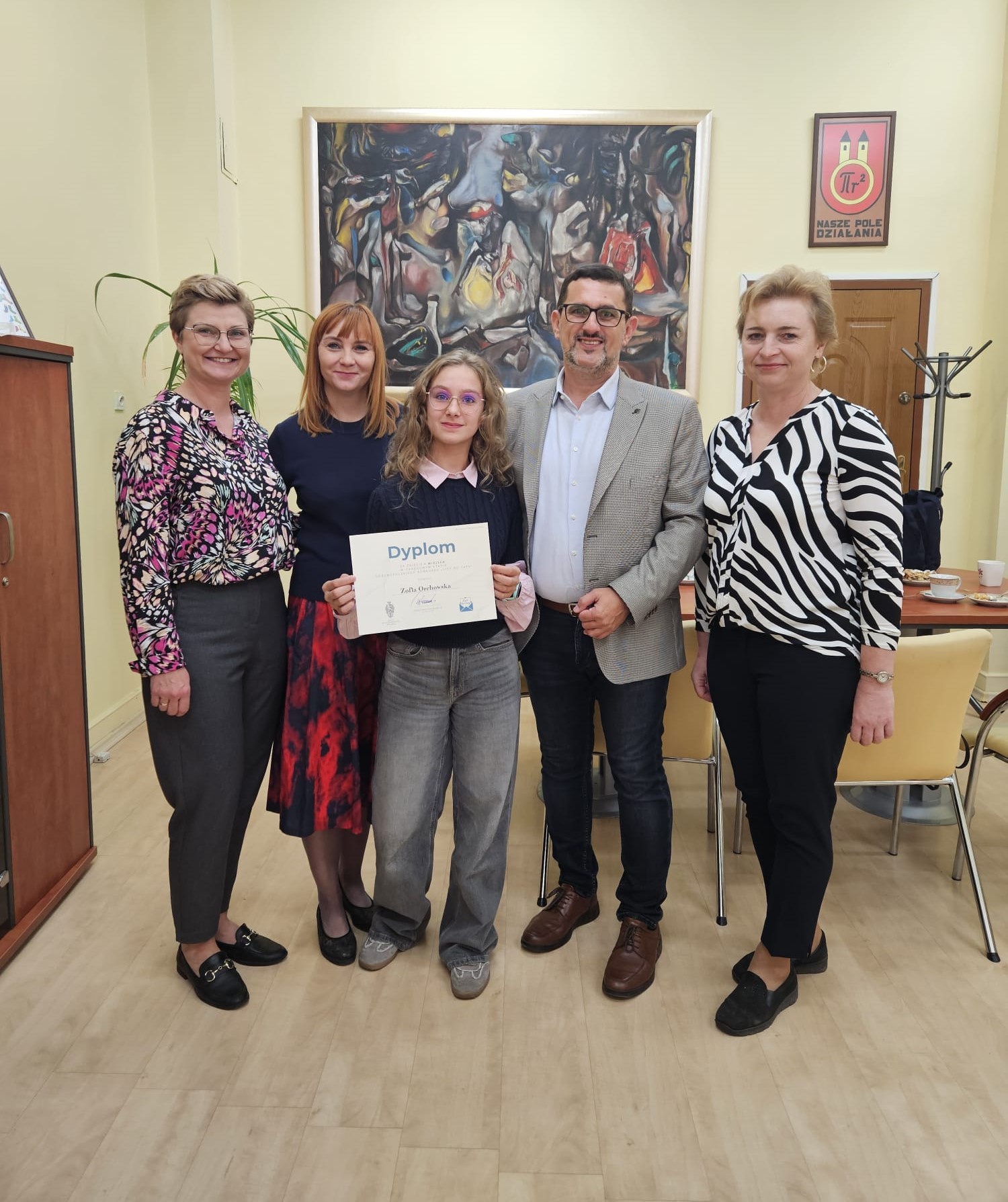 Na zdjęciu widać pięć osób stojących w pomieszczeniu biurowym. Osoba w środku, młoda dziewczyna, trzyma dyplom, a pozostałe osoby stoją obok niej, uśmiechając się do zdjęcia.