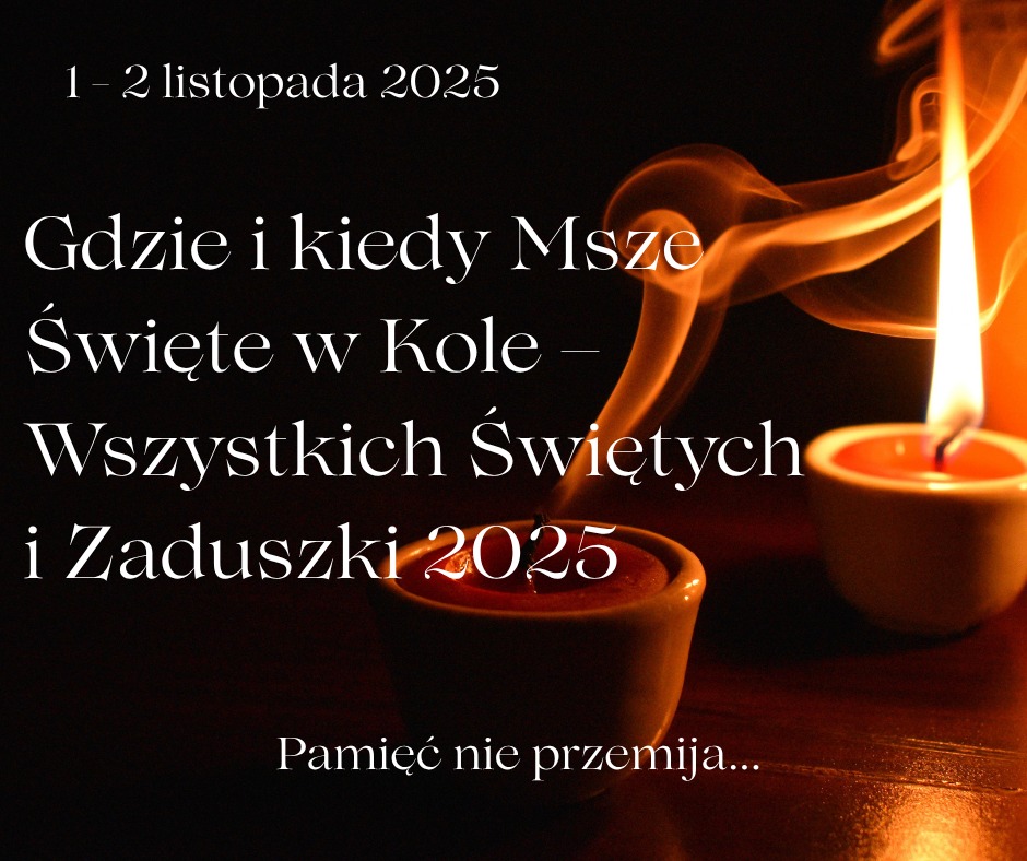 Parafia M.B. Częstochowskiej w Kole ogłasza: w sobotę, 1 listopada, Msze święte w naszym kościele o godz. 7:30; 9:00 i o godz. 18:00. Msze św. 2 listopada, w Dzień Zaduszny, tak jak w każdą niedzielę.