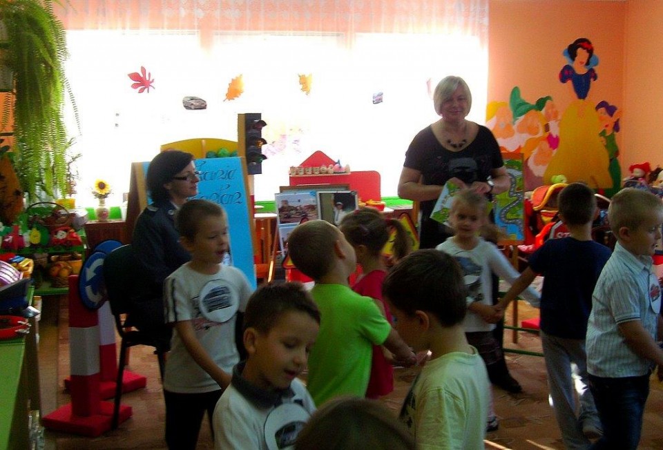 Po prezentacji, gość przedszkolaków pani Anna Drynkowska przeprowadziła z dziećmi pogadankę „Bezpiecznie w domu i poza nim”. Dzieci z pomocą pani sierżant poznały rozmaite sytuacje zagrażające zdrowiu i życiu. Wśród omawianych tematów znalazły się m. in.: bezpieczna droga do przedszkola, bezpieczeństwo zabaw, bezpieczeństwo dziecka w domu pod nieobecność rodziców, bezpieczeństwo dziecka w kontakcie z nieznanymi osobami, reagowanie w sytuacjach zagrożenia, prawidłowe korzystanie z numerów alarmowych.