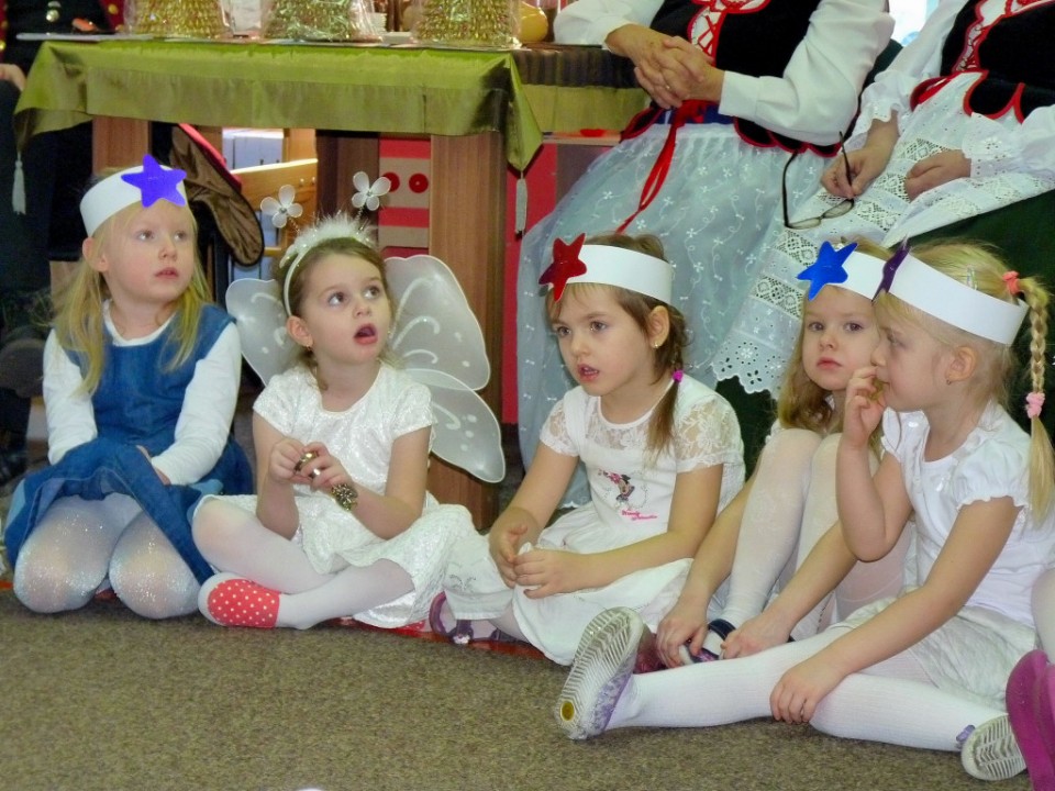 W zaprezentowanej inscenizacji, pojawiły się tradycyjne jasełkowe postacie. Tło stanowiła dekoracja z motywem szopki. Dopełnieniem była piosenka z choinką, makowcami, głosem dzwonka, pierwszą gwiazdką i leżącym na stole opłatkiem. Czteroletnie aniołki złożyły zebranym wierszowane świąteczne życzenia. Swoje role odegrały wyśmienicie wzbudzając uznanie gości i rówieśników. Potem ustąpiły miejsca na scenie „GRZEGORZEWIANKOM”. Ich barwne, stylizowane stroje przykuwały uwagę. Przedszkolaki chętnie współpracowały z kierownikiem artystycznym zespołu panem Mariuszem Andrzejewskim. Śpiewały fragmenty wybranych kolęd, nauczyły się też pastorałki „Józefie stajenki nie szukaj”. Gdy ponad setka gardełek intonowała „Pójdźmy wszyscy do stajenki” wszystkim udzielił się świąteczny nastrój. Pojawiło się też poczucie przedszkolnej wspólnoty. Wiadomo, muzyka łagodzi obyczaje i zbliża, co w czasie Świąt Bożego Narodzenia jest rzeczą niezmiernie ważną. Wielka w tym też zasługa artystów z zespołu ludowego. Ich ciepło , życzliwość i bezinteresowność były bezcenne.