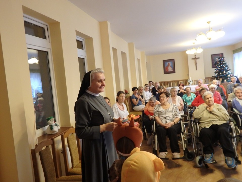 Dzieci przedstawiły Seniorom swoje przedstawienie jasełkowe. W związku ze zbliżającym się "Dniem Babci i Dziadka" nie zabrakło również wierszy i piosenki związanej z tym pięknym i ważnym dla każdego wnuka dniem. Występy artystyczne przedszkolaków dostarczyły mieszkańcom Domu wiele radości i wzruszeń. Mali artyści w dowód wdzięczności otrzymali słodycze, a my przekazaliśmy na pamiątkę własnoręcznie zrobioną laurkę. Spotkanie z pensjonariuszami to dla przedszkolaków prawdziwa lekcja wychowawcza, która uczy szacunku i życzliwości dla drugiego człowieka.