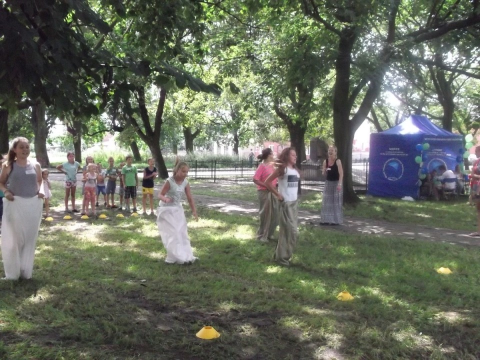 Dzieci z dużą aktywnością włączyły się w zabawy ruchowe z piłką, ringiem, itp. Młodsi uczestnicy bawili się przy łowieniu rybek, rzucaniu do tarczy, malowaniu kredą.