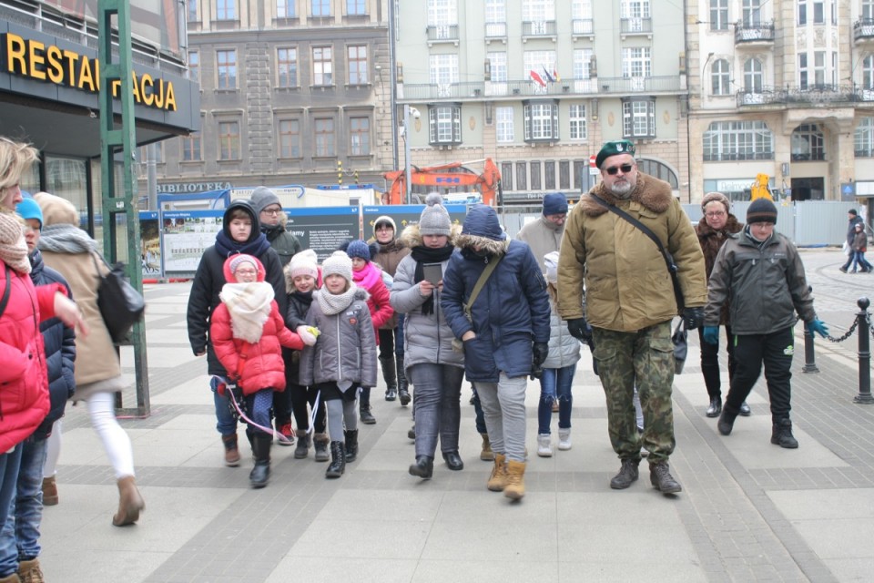 Na uczestników wycieczki czekała jeszcze około półgodzinna opowieść Piotra Grabowskiego o trudnej i jakże odpowiedzialnej pracy aktora lalkarza i za chwilę pod Poznańskimi Krzyżami grupa z Koła spotkała się z kapitanem Wojska Polskiego Andrzejem Ohde, który wprowadził młodych kolan w burzliwą historię narodowych zrywów niepodległościowych 1956 – 1981 i w wydarzenia sprzed 100 laty, z okresu Powstania Wielkopolskiego. Kpt. Ohde ciekawie opowiedział o Ignacym Paderewskim, o Franciszku Ratajczaku pierwszym poległym powstańcu, o wydarzeniach z tamtego okresu prowadząc grupę szlakiem wydarzeń Poznańskiego Czerwca oraz z 1918 roku. Po niemal godzinnym spacerze ulicami Poznania kolanie dotarli do Domu Żołnierza siedziby Zarządu Wojewódzkiego LOK, gdzie przywitał ich ppłk Bogdan Mrowiec dyrektor Biura WZW LOK w Poznaniu. Grupa była zziębniętą, więc wszystkim uczestnikom wyprawy do Poznania gospodarz Domu Żołnierza ufundował gorący posiłek.