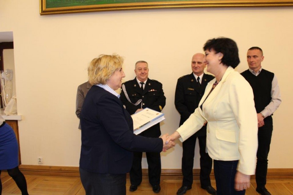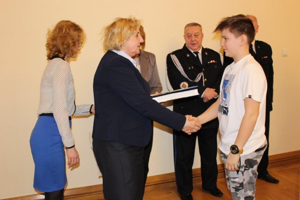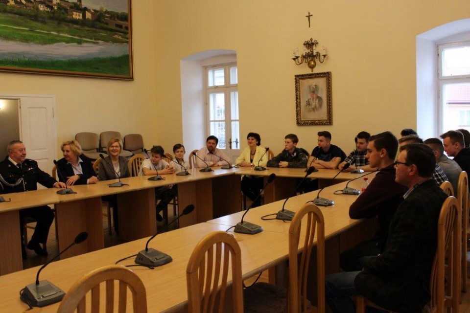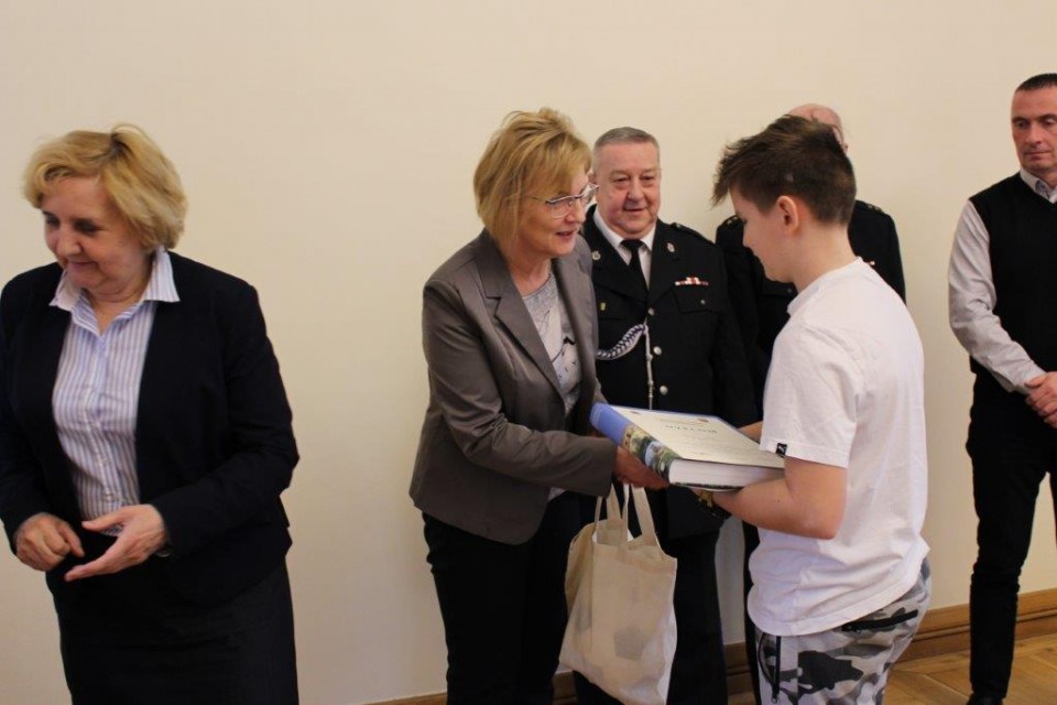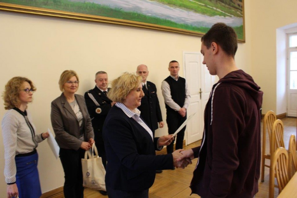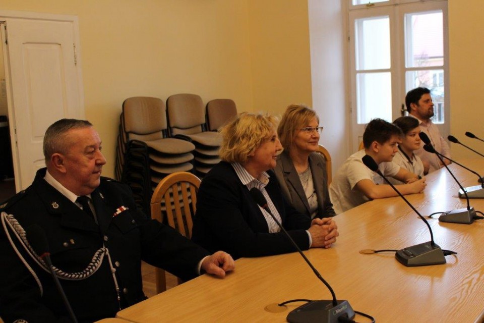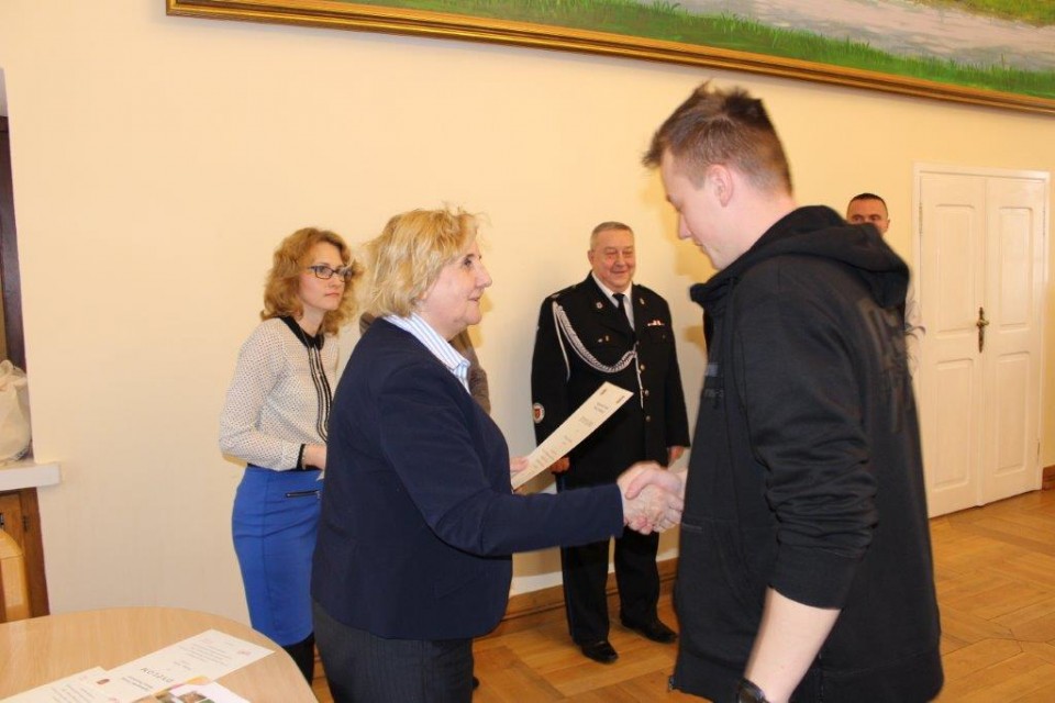 Zebraną w ratuszu młodzież wraz z opiekunami powitali: Z-ca burmistrza miasta Koła Elżbieta Modrzejewska, sekretarz miasta Barbara Szelągowska-Bugajak, prezes zarządu Oddziału Miejskiego Związku OSP RP w Kole Jerzy Budka, reprezentujący Komendanta Powiatowego Państwowej Straży Pożarnej w Kole kapitan Mirosław Łukaski, naczelnik Wydziału Organizacyjno-Administracyjnego Artur Zwierzyński i inspektor wydziału Edyta Adamczyk. Młodzieży z kolskich placówek towarzyszyli nauczyciele: z Zespołu Szkół Technicznych Alina Walasek, z Zespołu Szkół Ekonomiczno-Administracyjnych Mieczysław Wojtasik oraz ze Szkoły Podstawowej nr 3 Sebastian Kalinowski. Na uroczyste wręczenie nagród nie mogli przybyć laureaci z LO wraz z opiekunem Januszem Miłowskim, ale organizatorzy zadbali o to, by zasłużone nagrody trafiły do rąk młodzieży.