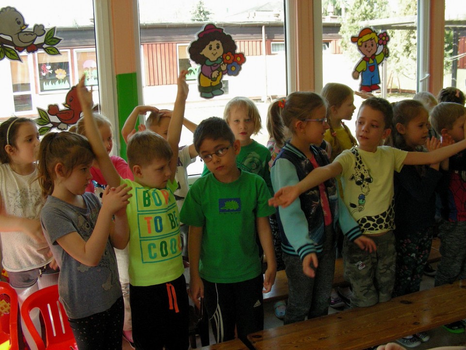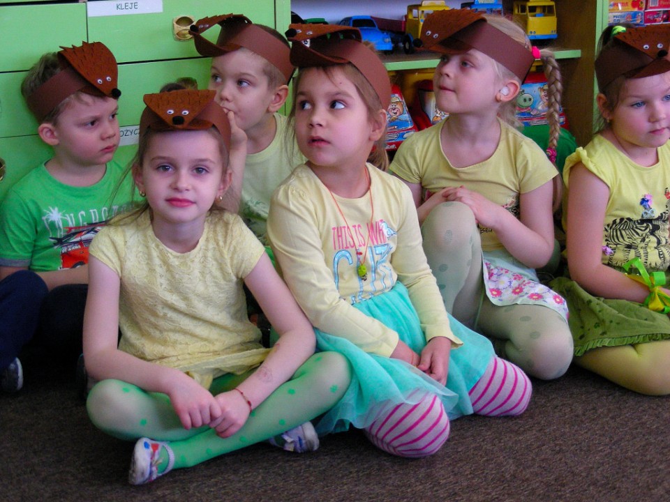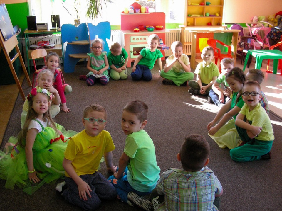 Było zatem o marcowej pogodzie, budzących się ze snu zimowego zwierzętach w tym jeżach, które gromadnie wyszły na wiosenny spacer, wielu innych przejawach wiosny i jej ulubionych barwach. W pierwszym jej dniu u pięciolatków królował zdecydowanie kolor zielony i żółty, nie mogło być przecież inaczej.