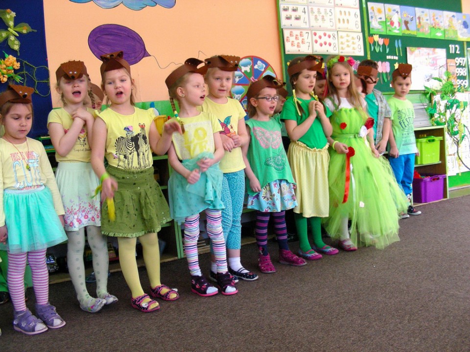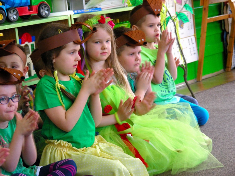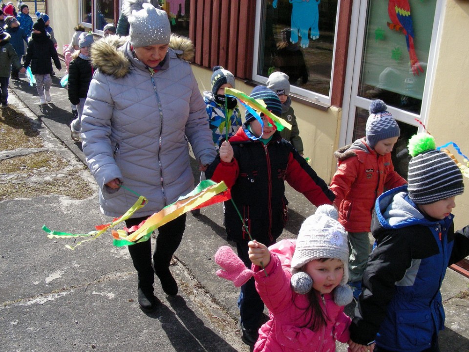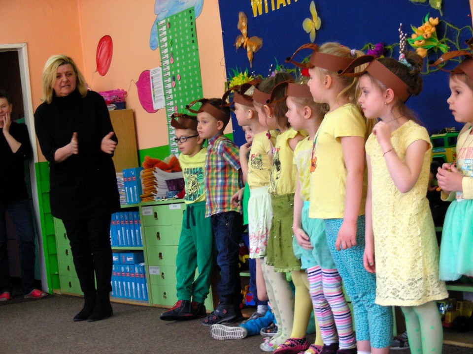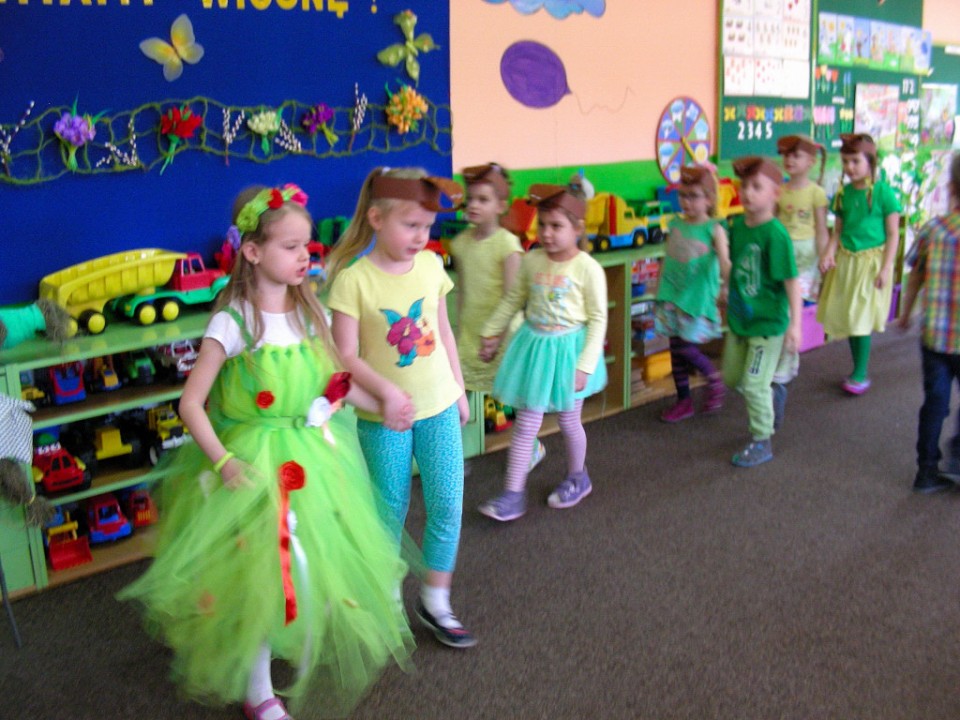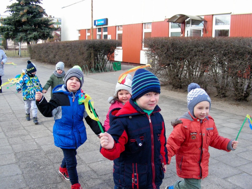 O zwyczajach ludowych związanych z pożegnaniem zimy i powitaniem kolejnej pory roku pięciolatki opowiadały wierszem i piosenką. Filip dzielnie pomagał odpłynąć Marzannie za siódme morze, a Bartek gaikiem przywołał Wiosnę. W jej roli wystąpiła Ala, której przepiękną zieloną suknię podziwiali wszyscy.