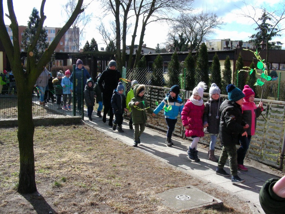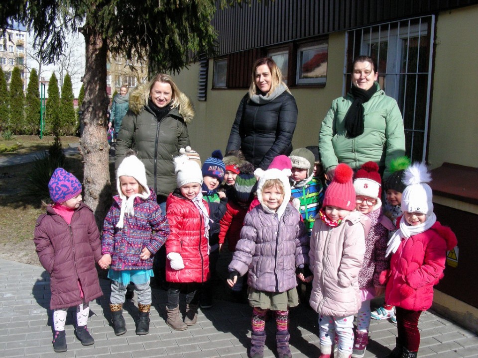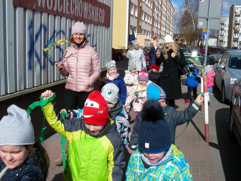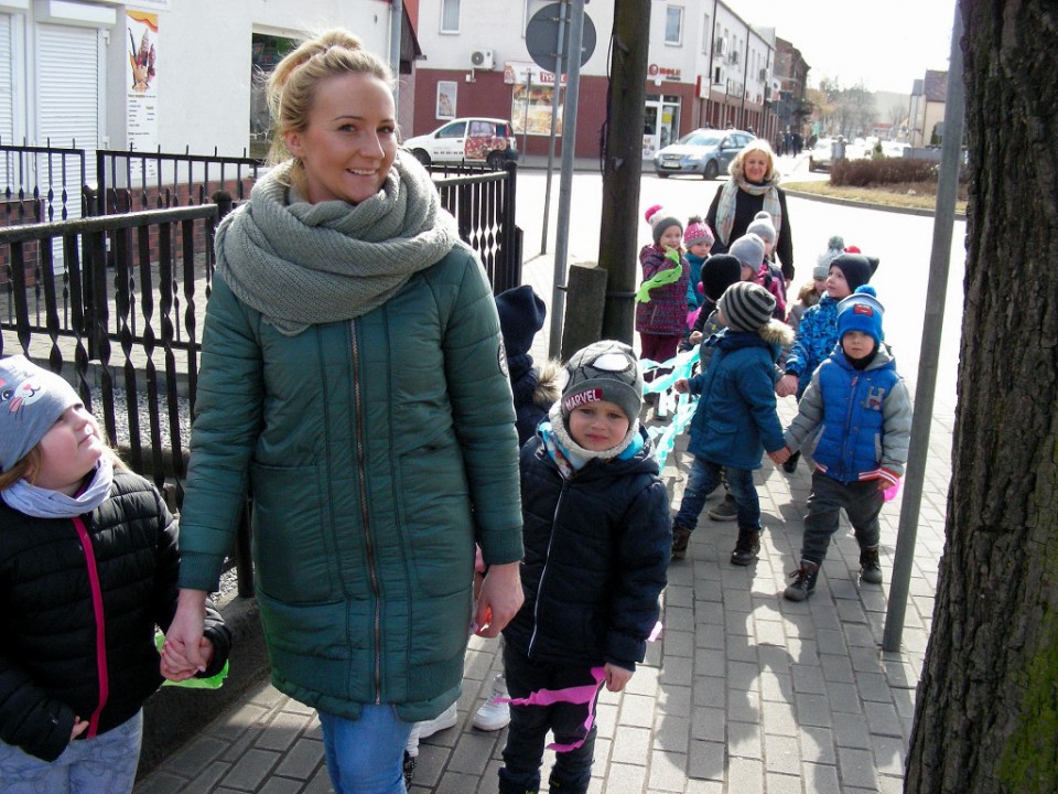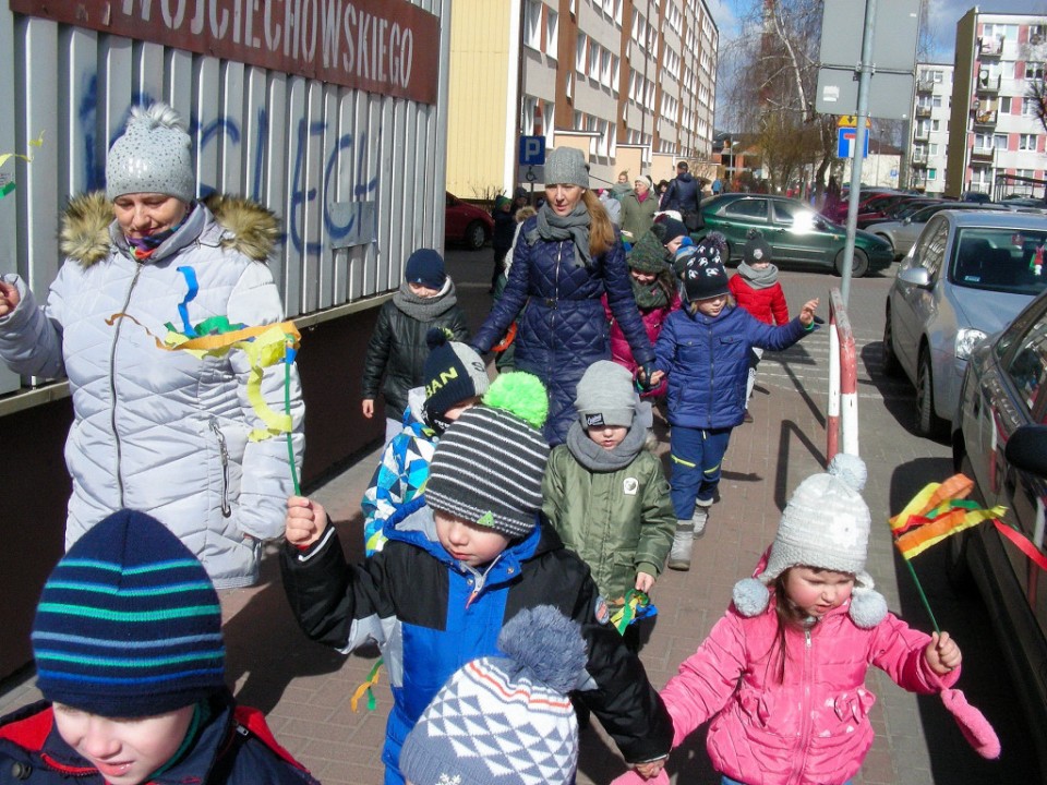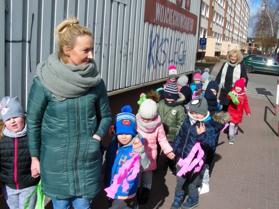 Po spotkaniu przedszkolaki udały się na wiosenny spacer w pobliżu przedszkola, by o nadejściu wiosny przypomnieć innym mieszkańcom naszego miasta.