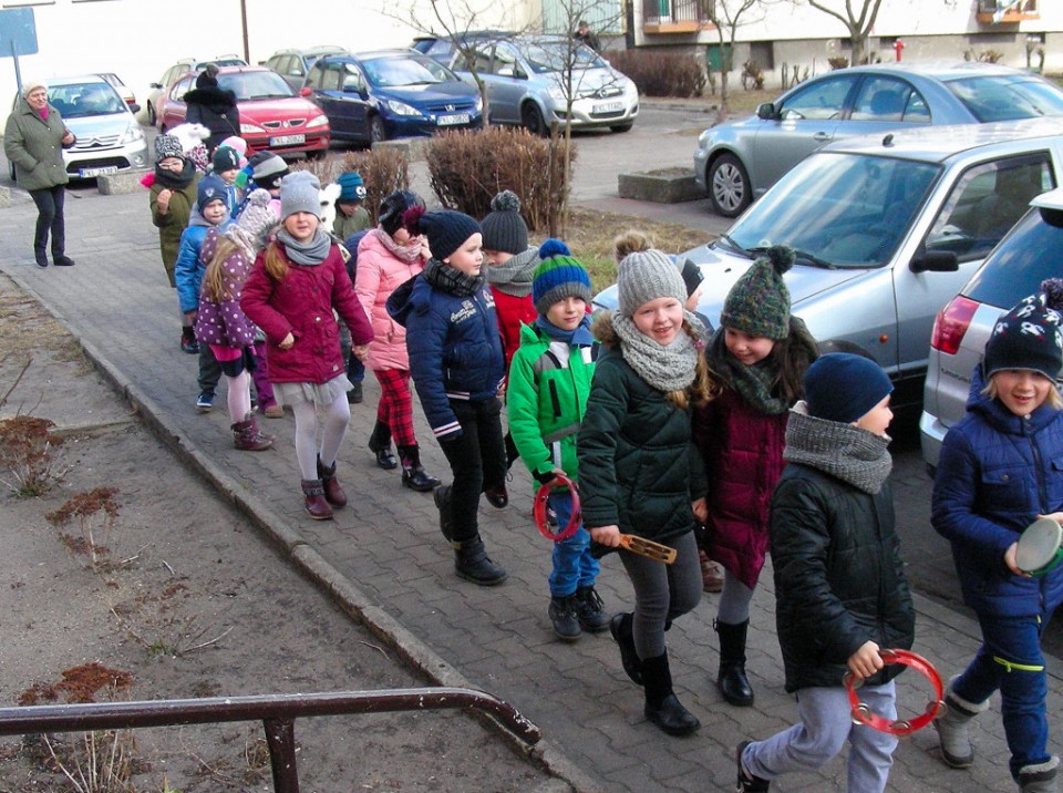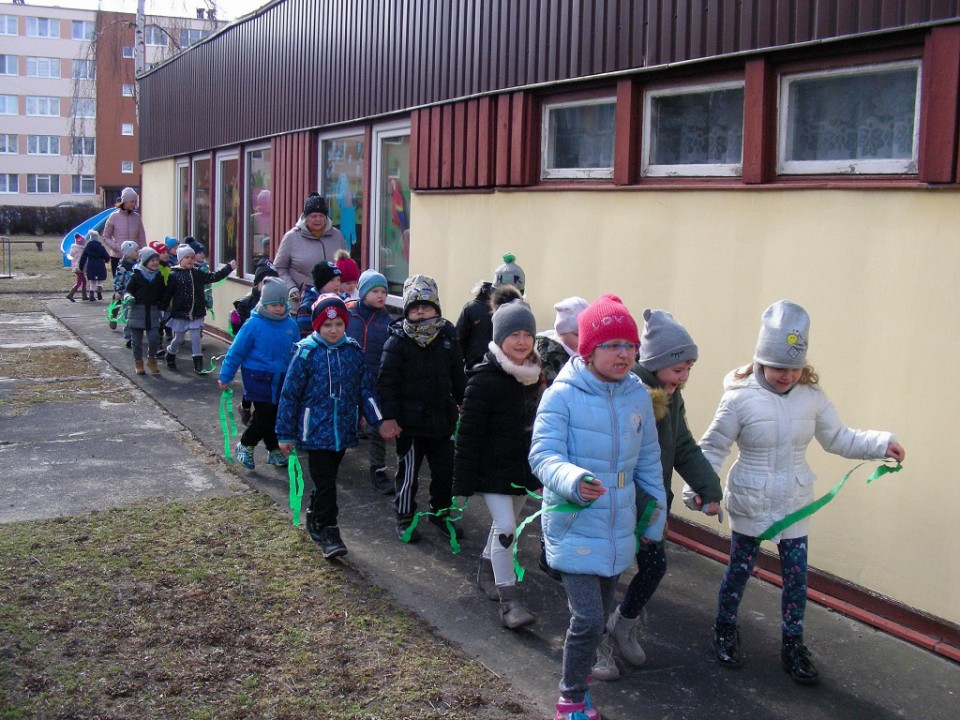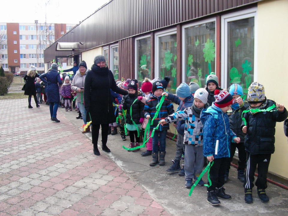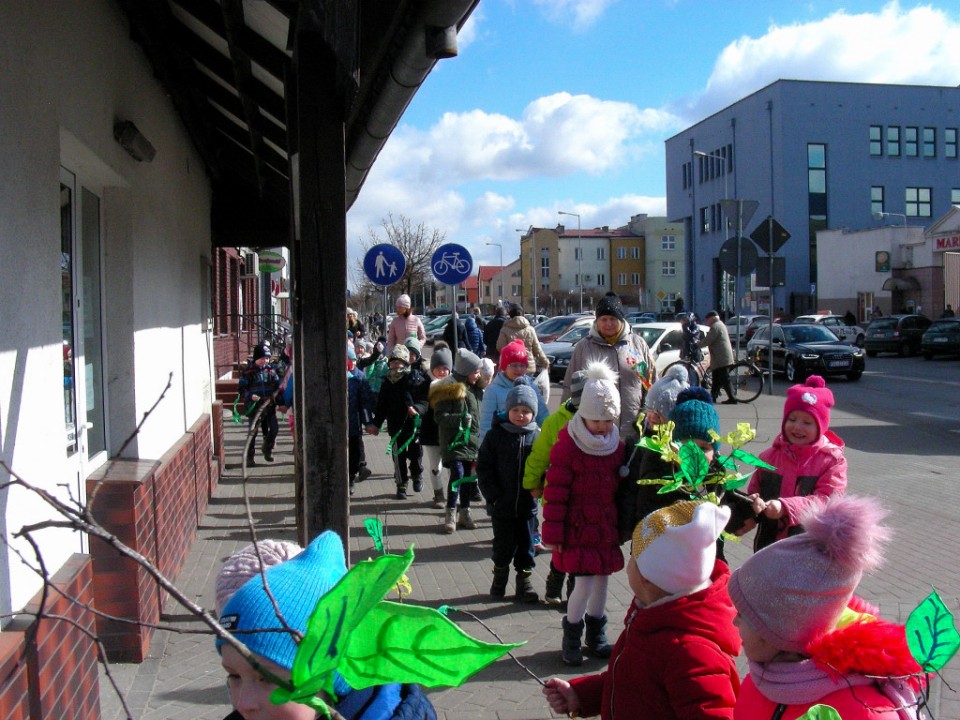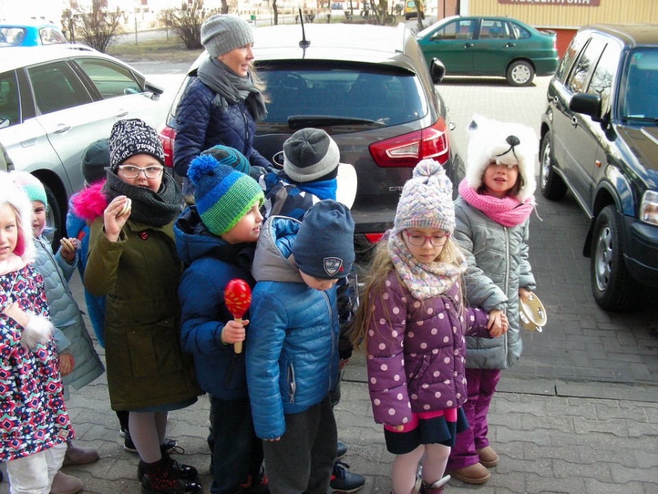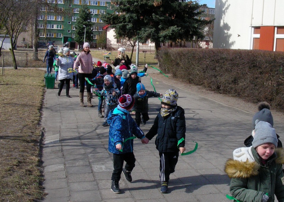 Po spotkaniu przedszkolaki udały się na wiosenny spacer w pobliżu przedszkola, by o nadejściu wiosny przypomnieć innym mieszkańcom naszego miasta.