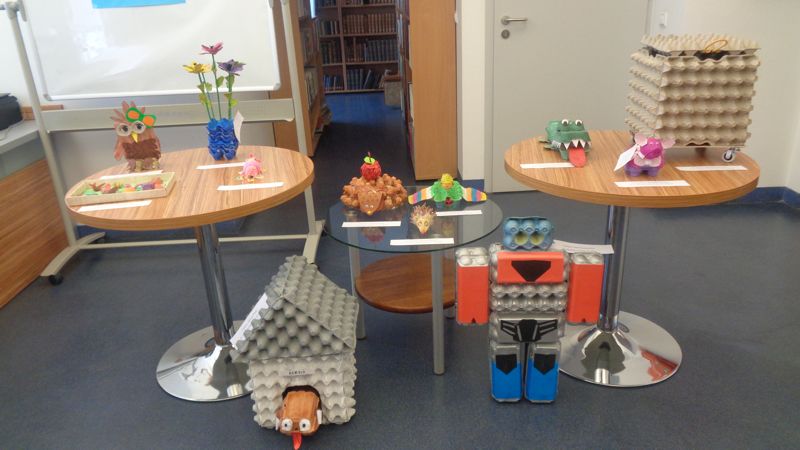 zadaniem: artystyczne wykorzystanie – w ramach recyklingu – „wytłaczanki” i stworzenie z niej swoistego dzieła sztuki, także użytkowej; uczestnikami: dzieci w wieku przedszkolnym,