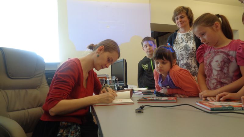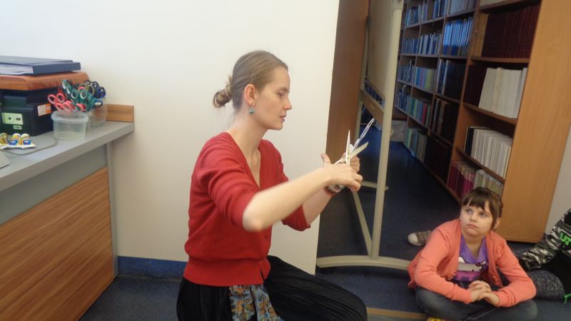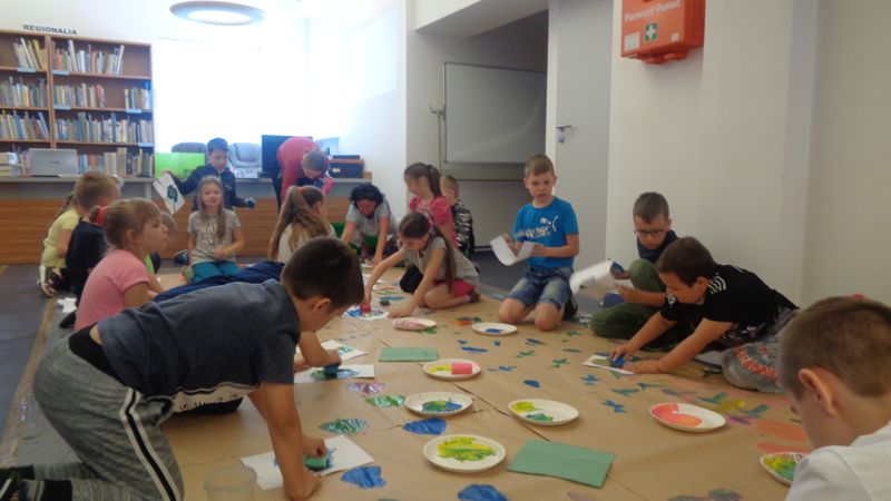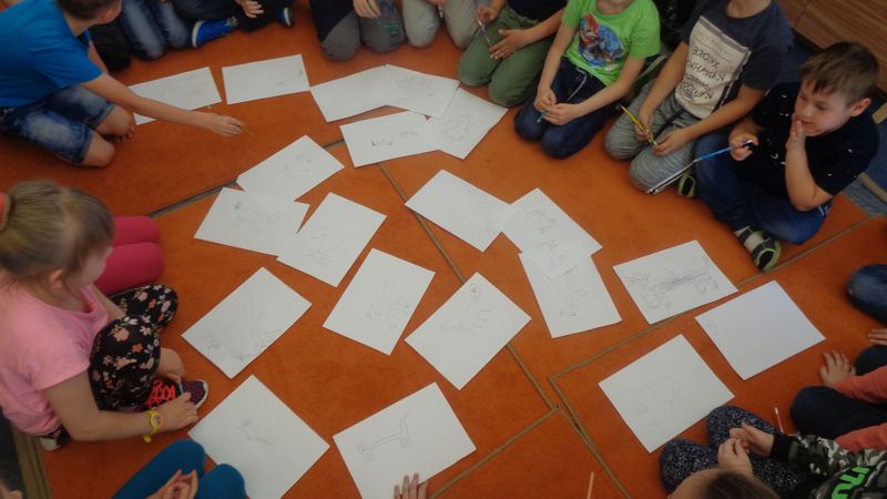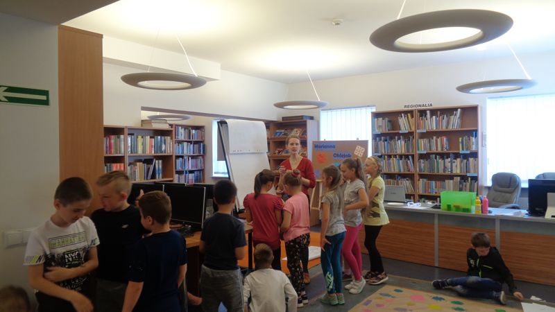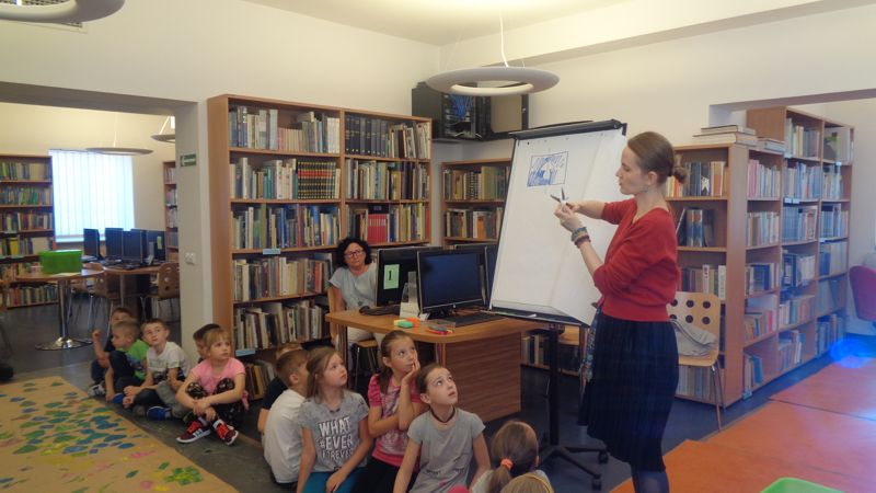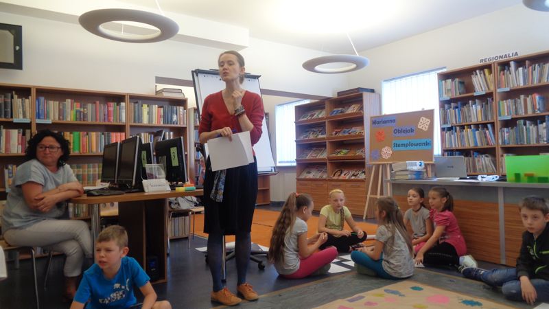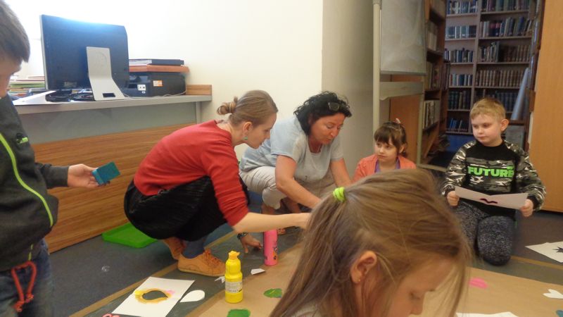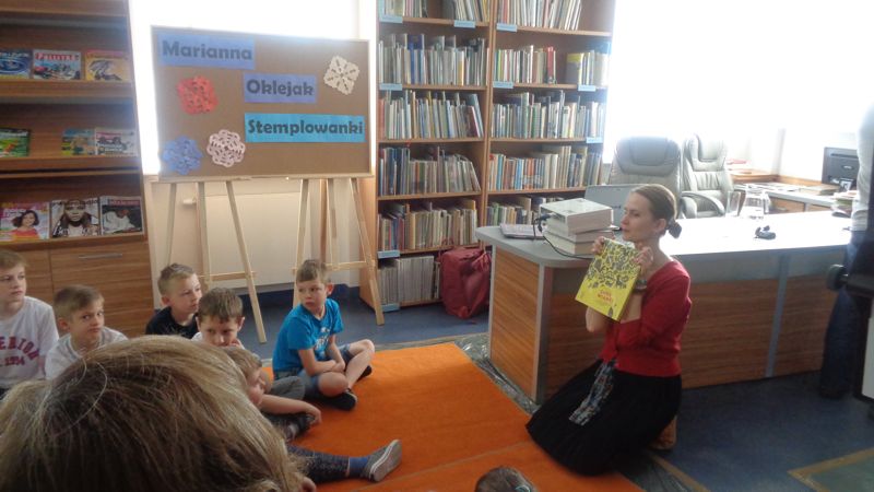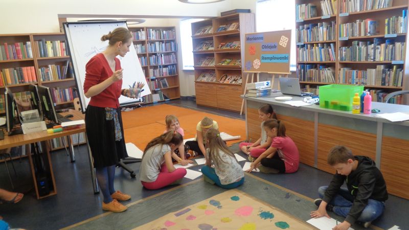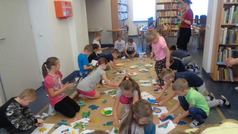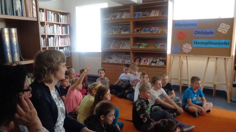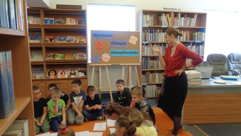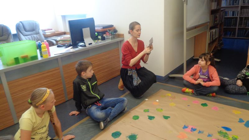 Dzieci - ze Szkoły Podstawowej nr 4 w Kole oraz Specjalnego Ośrodka Szkolno-Wychowawczego w Kole, podczas dwugodzinnego spotkania z ilustrarorką - poznały książkę, krótko porozmawiały z gościem o folklorze - czym jest, z czym się kojarzy. Poznały drukowane tkaniny tarnogrodzkie, i co zrobić, żeby osiągnąć podobny efekt? Tworzyły własne stemple i szablony (przy okazji dotykając tematu wycinanek). Kolor na warsztatach dominował - młodzi czytelnicy uczyli się mieszania podstawowych kolorów, zależności kolorystycznych. Podczas zabawy powstała dywanowa praca malarska.