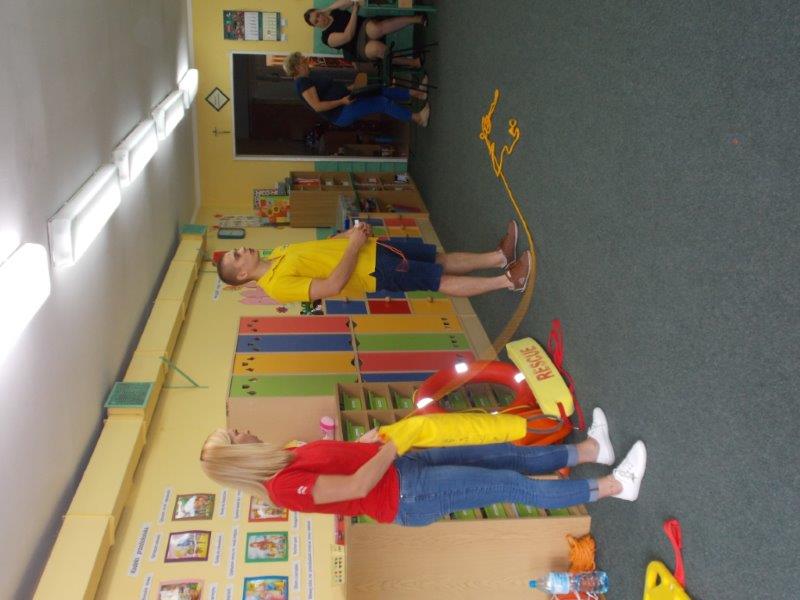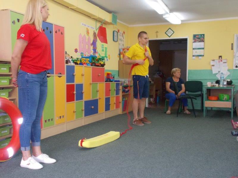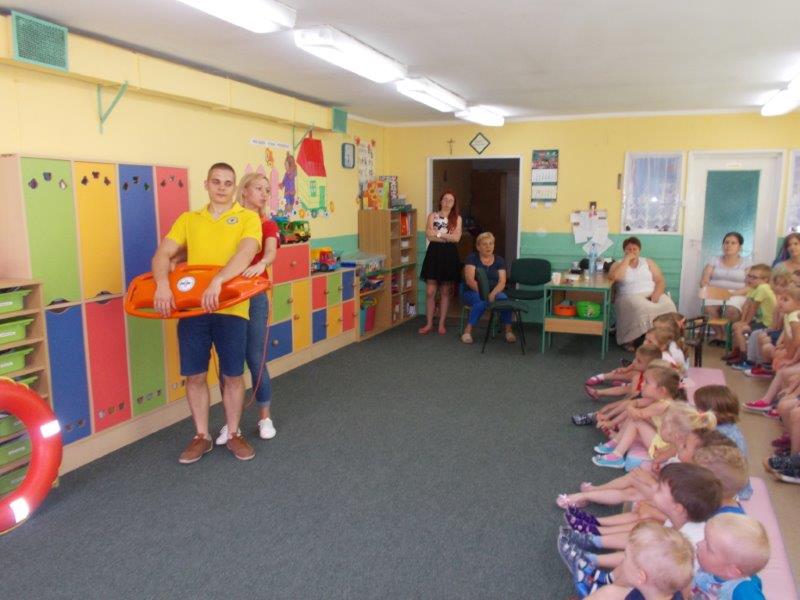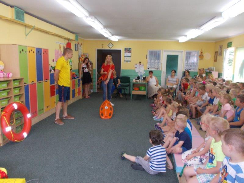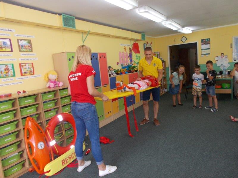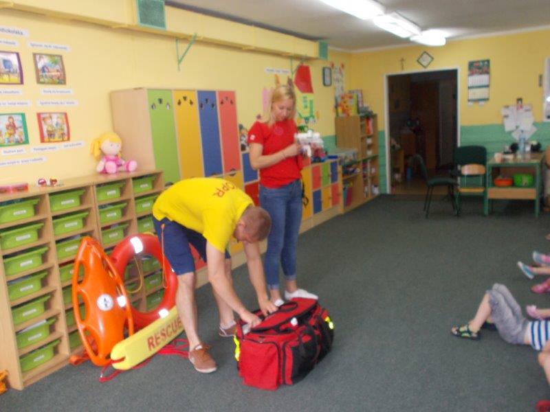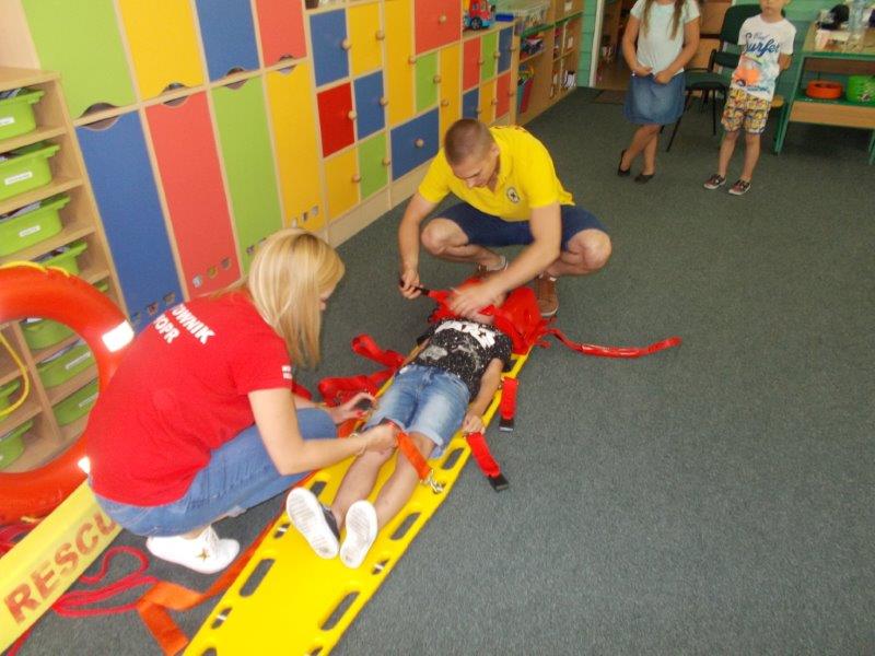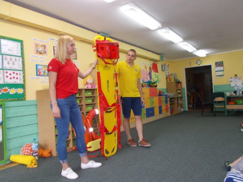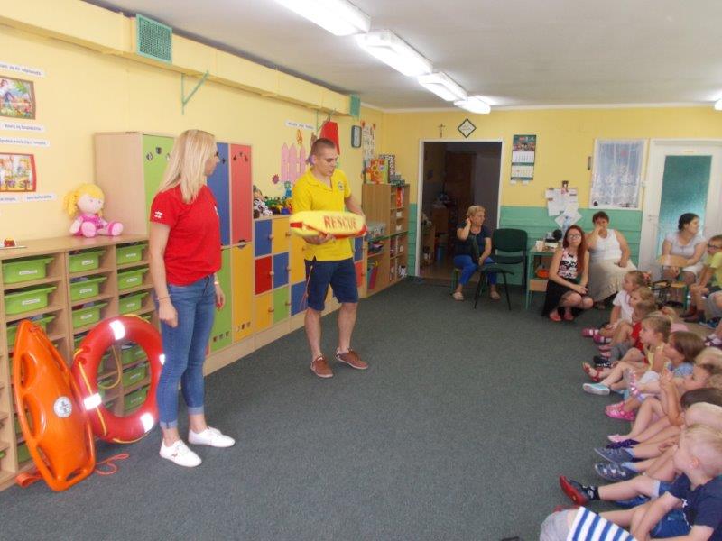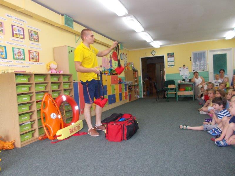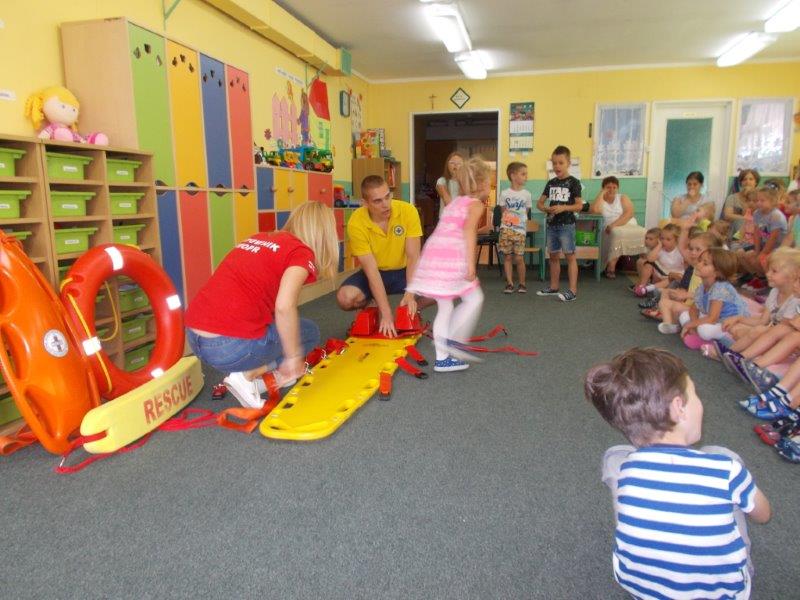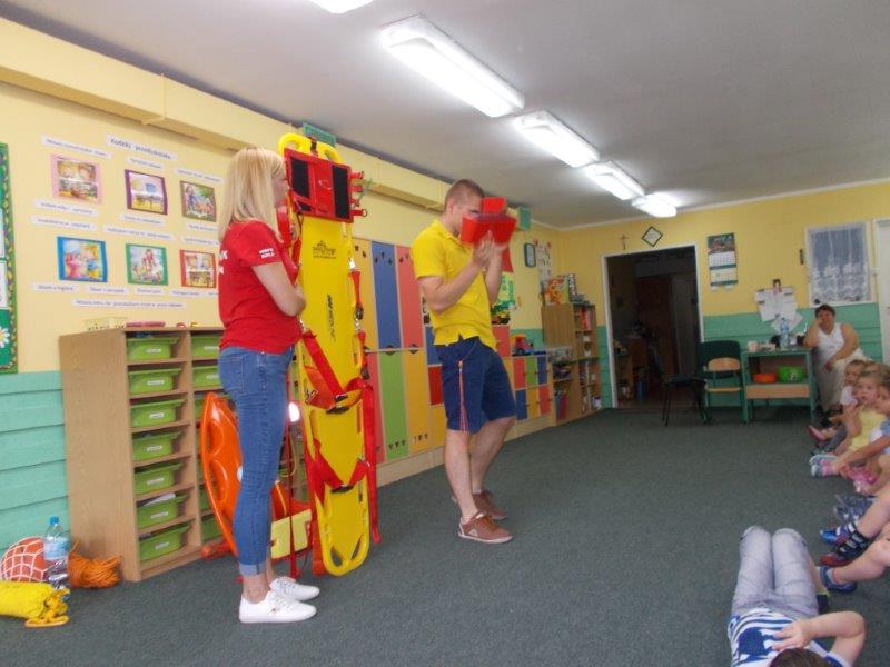 Na początku Pan Eryk i Pani Żaneta przedstawili podstawowe zasady obowiązujące podczas pływania w kąpieliskach: nie wolno kąpać się bez zgody i opieki dorosłych, nie wolno wchodzić do wody bezpośrednio po jedzeniu oraz po długim pobycie na słońcu. Ponadto z pomocą ratowników dzieci przypomniały sobie numery alarmowe. Następnie ratownicy przeszli do zaprezentowania sprzętu ratowniczego, z którego korzystają w swojej pracy. Oglądanie sprzętu połączone z informacjami na temat jego zastosowania i przeznaczenia sprawiły dzieciom ogromną przyjemność i jednocześnie było przekazem ogromnej wiedzy naszym dzieciom. Pani Żaneta i Pan Eryk pokazali takie sprzęty jak np.: koło ratunkowe, boję SP inaczej nazywaną „pamelką”, rzutkę rękawową, rzutkę siatkową, pas ratowniczy „Węgorz”, deskę ortopedyczną, a także całe wyposażenie apteczki. Nasi goście podczas prezentacji sprzętu zaprosili do współpracy kilkoro dzieci, które zostały przez nich umieszczone na desce ortopedycznej. Była to atrakcja nie tylko dla uczestników pokazu, ale wszystkich dzieci, dopingujących swoich kolegów. Ostatnimi punktami zajęć było zaprezentowanie przedszkolakom schematu postępowania przy udzielaniu pierwszej pomocy, a także sposobu ułożenia poszkodowanego w pozycji bocznej bezpiecznej.
