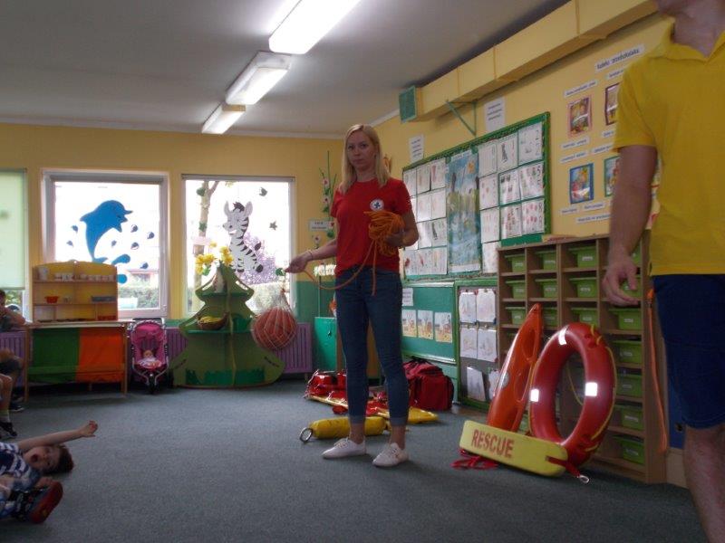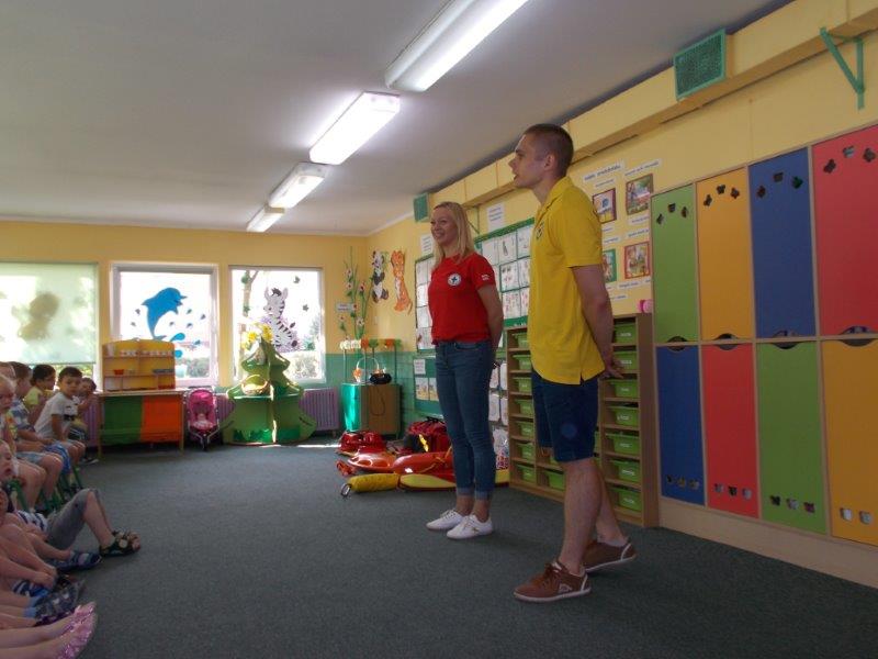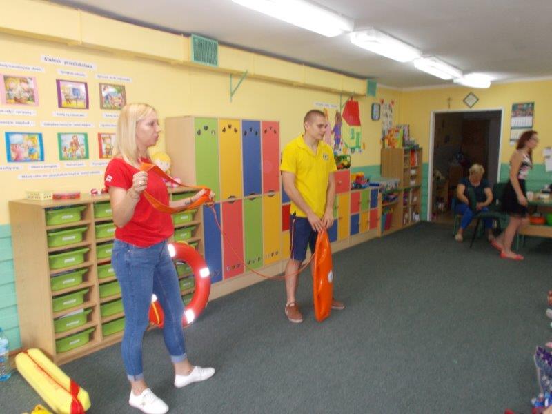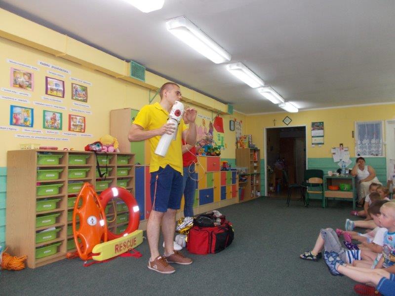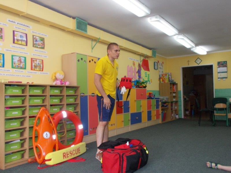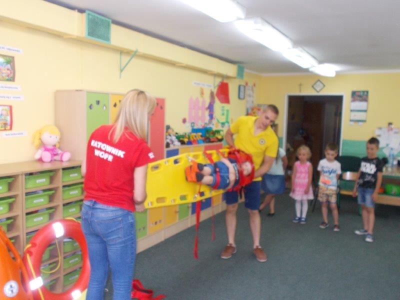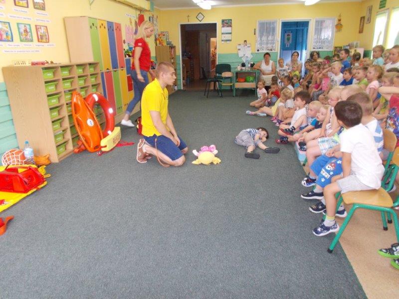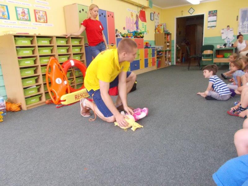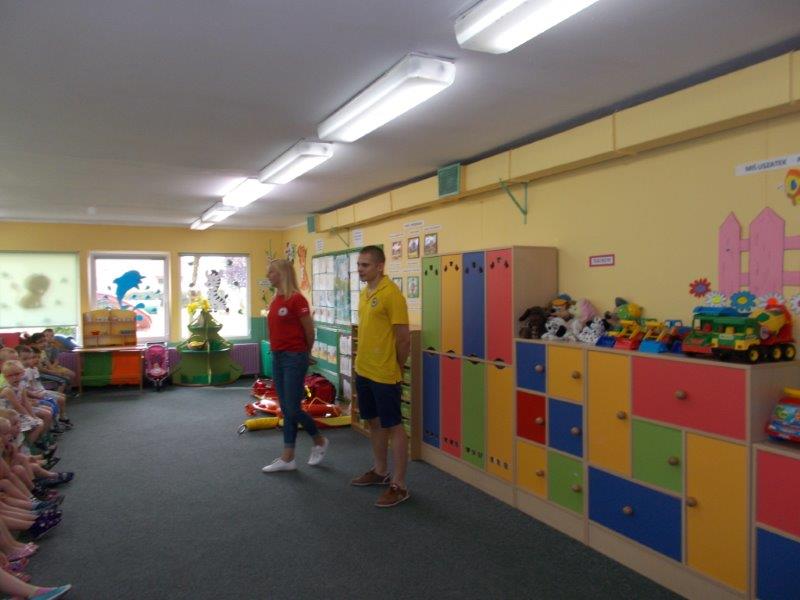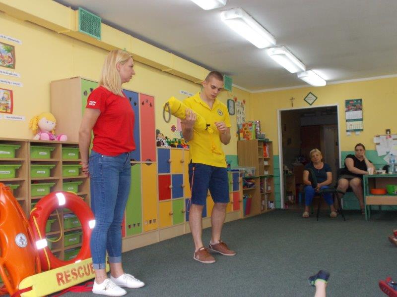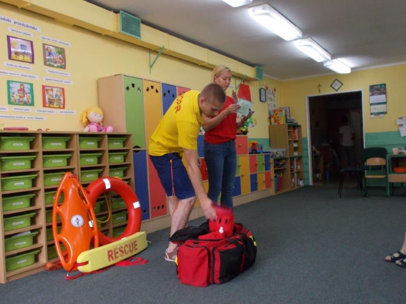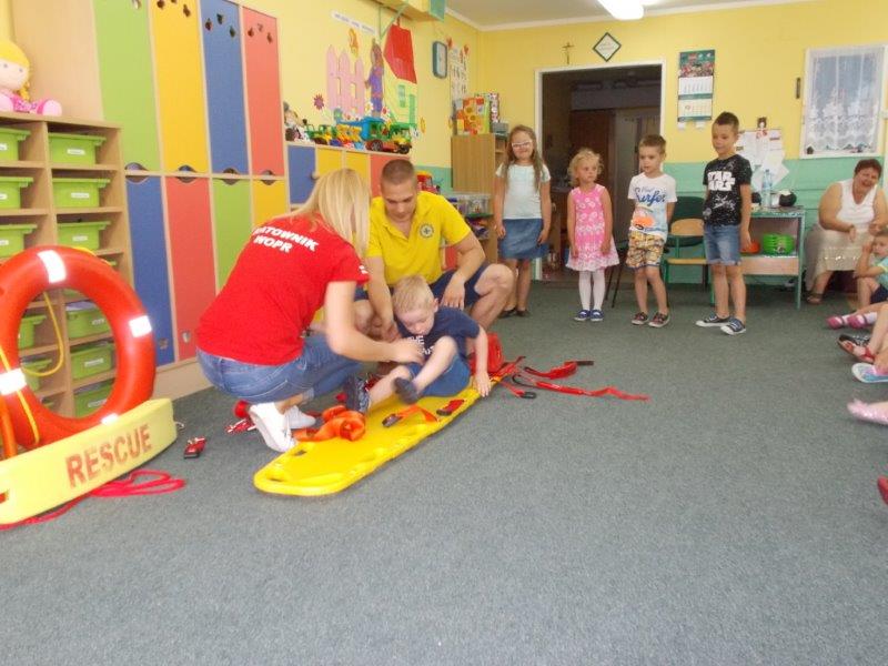 Na początku Pan Eryk i Pani Żaneta przedstawili podstawowe zasady obowiązujące podczas pływania w kąpieliskach: nie wolno kąpać się bez zgody i opieki dorosłych, nie wolno wchodzić do wody bezpośrednio po jedzeniu oraz po długim pobycie na słońcu. Ponadto z pomocą ratowników dzieci przypomniały sobie numery alarmowe. Następnie ratownicy przeszli do zaprezentowania sprzętu ratowniczego, z którego korzystają w swojej pracy. Oglądanie sprzętu połączone z informacjami na temat jego zastosowania i przeznaczenia sprawiły dzieciom ogromną przyjemność i jednocześnie było przekazem ogromnej wiedzy naszym dzieciom. Pani Żaneta i Pan Eryk pokazali takie sprzęty jak np.: koło ratunkowe, boję SP inaczej nazywaną „pamelką”, rzutkę rękawową, rzutkę siatkową, pas ratowniczy „Węgorz”, deskę ortopedyczną, a także całe wyposażenie apteczki. Nasi goście podczas prezentacji sprzętu zaprosili do współpracy kilkoro dzieci, które zostały przez nich umieszczone na desce ortopedycznej. Była to atrakcja nie tylko dla uczestników pokazu, ale wszystkich dzieci, dopingujących swoich kolegów. Ostatnimi punktami zajęć było zaprezentowanie przedszkolakom schematu postępowania przy udzielaniu pierwszej pomocy, a także sposobu ułożenia poszkodowanego w pozycji bocznej bezpiecznej.