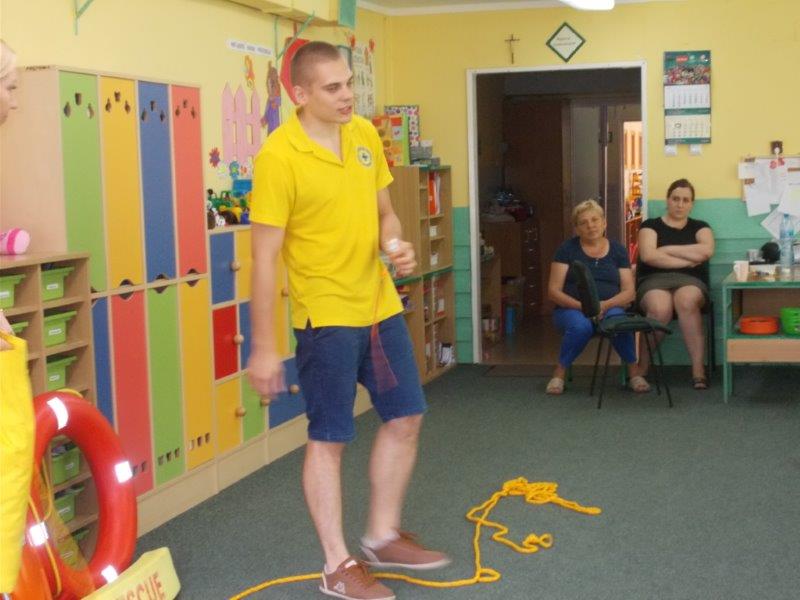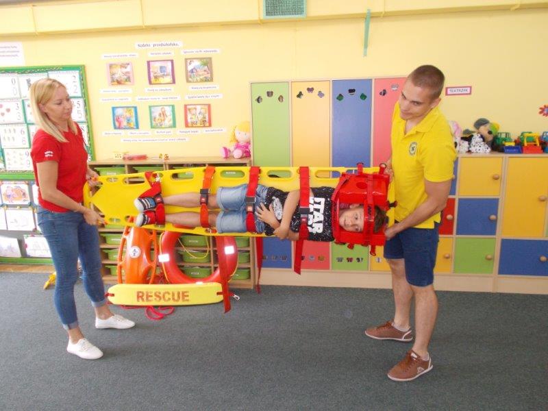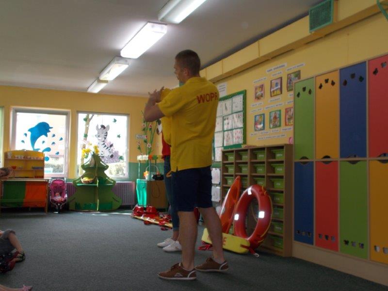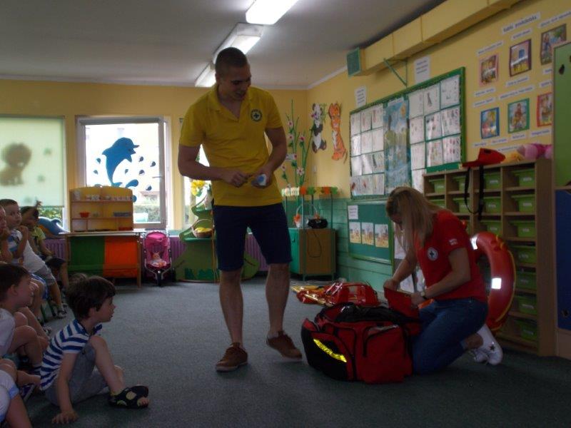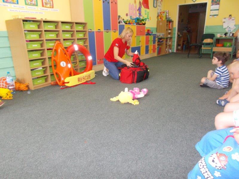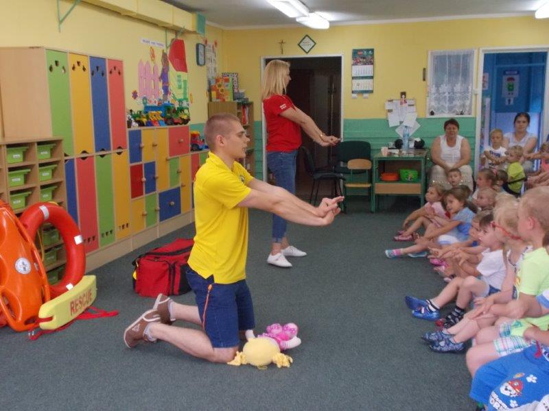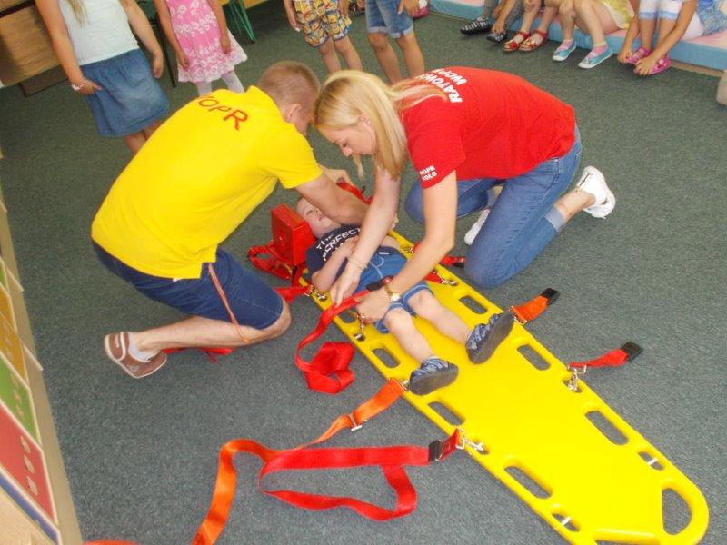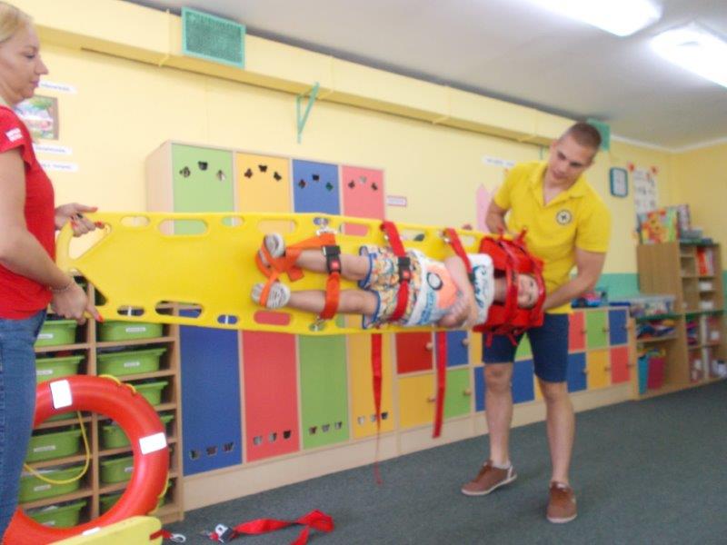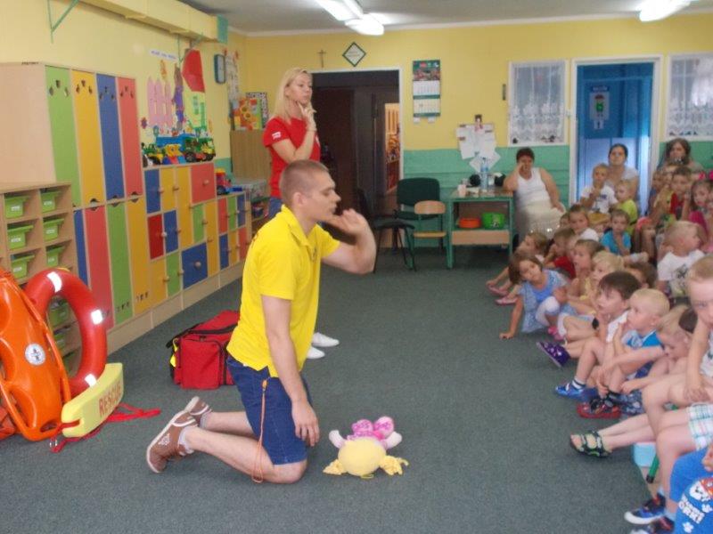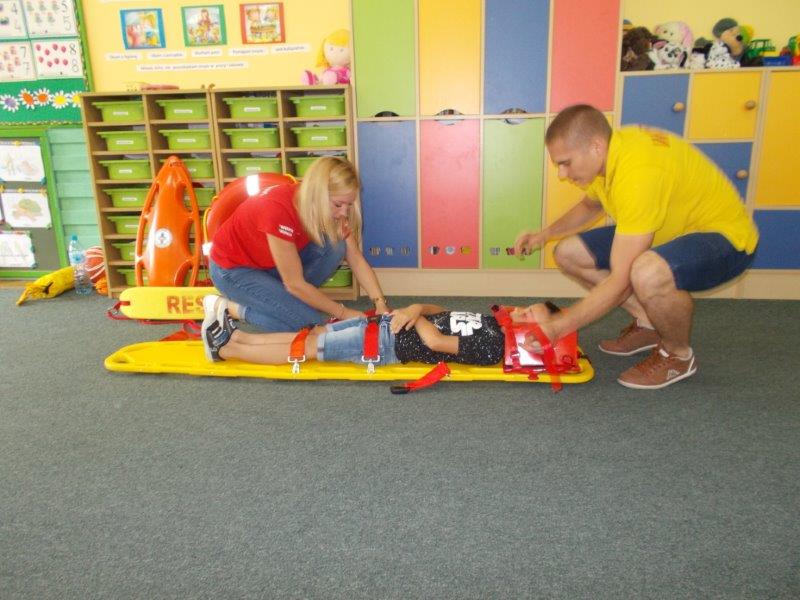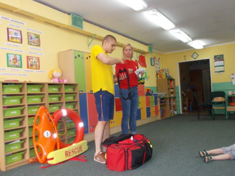Na początku Pan Eryk i Pani Żaneta przedstawili podstawowe zasady obowiązujące podczas pływania w kąpieliskach: nie wolno kąpać się bez zgody i opieki dorosłych, nie wolno wchodzić do wody bezpośrednio po jedzeniu oraz po długim pobycie na słońcu. Ponadto z pomocą ratowników dzieci przypomniały sobie numery alarmowe. Następnie ratownicy przeszli do zaprezentowania sprzętu ratowniczego, z którego korzystają w swojej pracy. Oglądanie sprzętu połączone z informacjami na temat jego zastosowania i przeznaczenia sprawiły dzieciom ogromną przyjemność i jednocześnie było przekazem ogromnej wiedzy naszym dzieciom. Pani Żaneta i Pan Eryk pokazali takie sprzęty jak np.: koło ratunkowe, boję SP inaczej nazywaną „pamelką”, rzutkę rękawową, rzutkę siatkową, pas ratowniczy „Węgorz”, deskę ortopedyczną, a także całe wyposażenie apteczki. Nasi goście podczas prezentacji sprzętu zaprosili do współpracy kilkoro dzieci, które zostały przez nich umieszczone na desce ortopedycznej. Była to atrakcja nie tylko dla uczestników pokazu, ale wszystkich dzieci, dopingujących swoich kolegów. Ostatnimi punktami zajęć było zaprezentowanie przedszkolakom schematu postępowania przy udzielaniu pierwszej pomocy, a także sposobu ułożenia poszkodowanego w pozycji bocznej bezpiecznej.