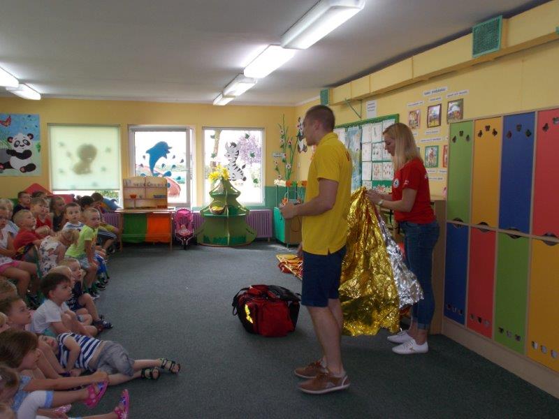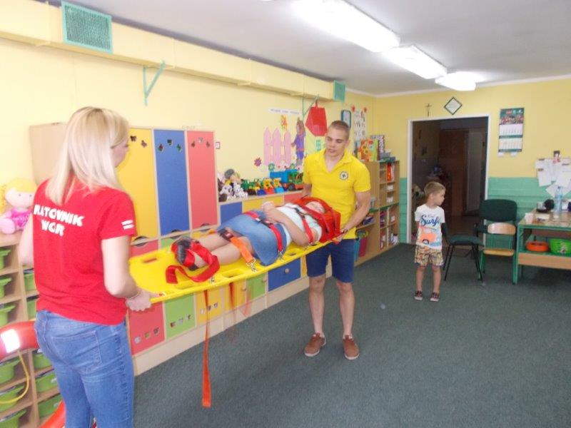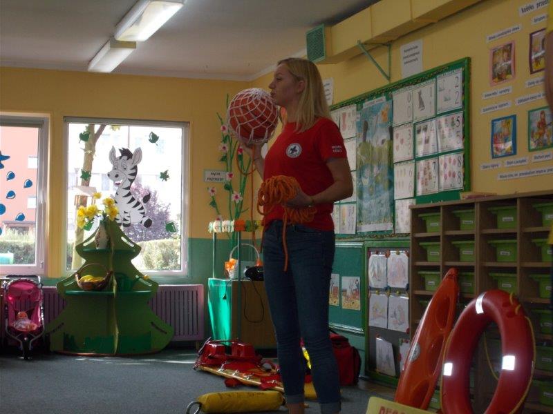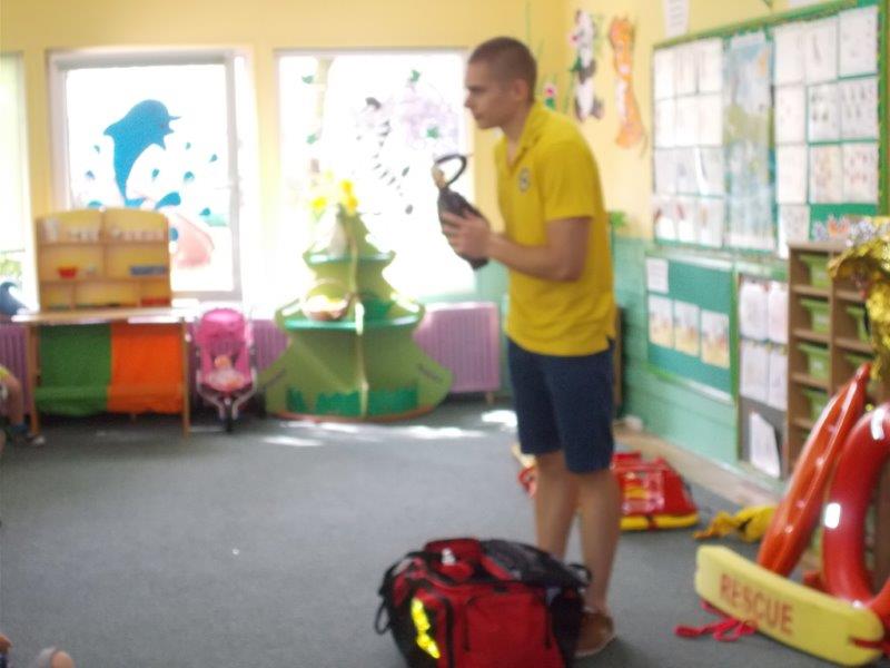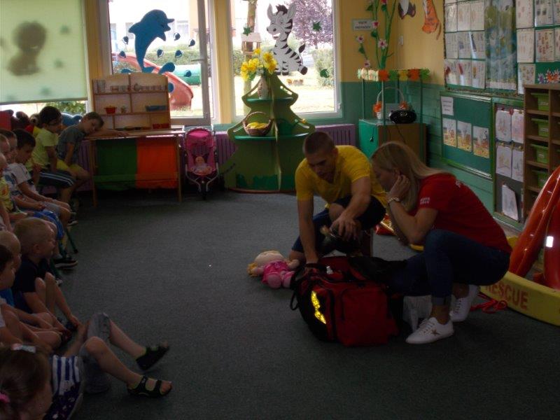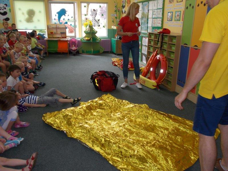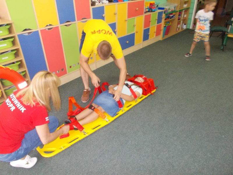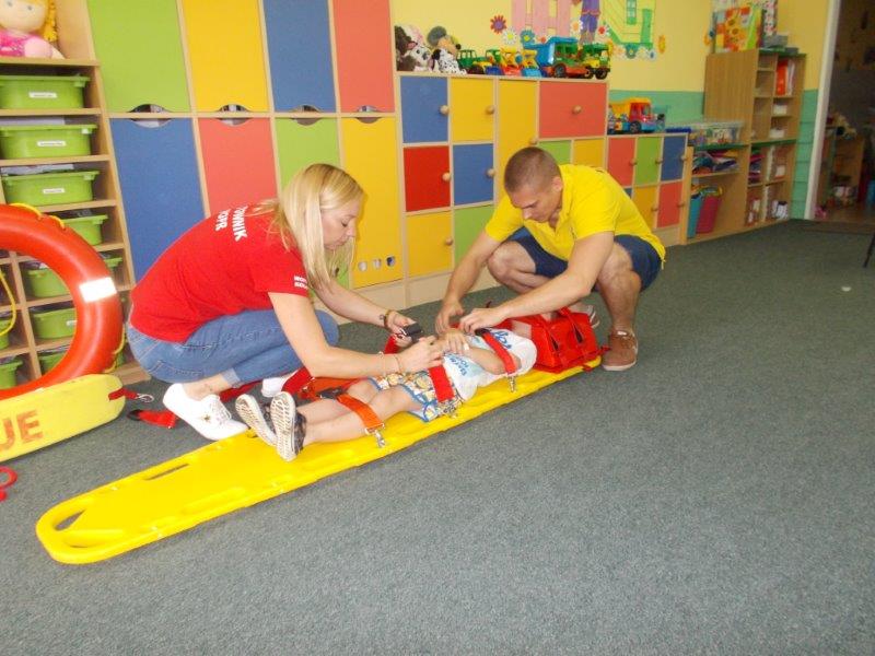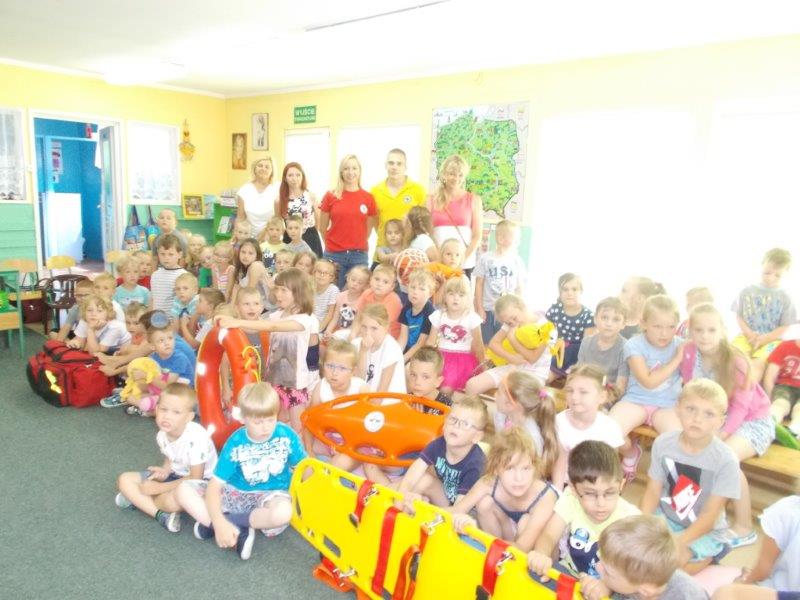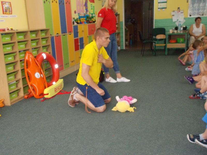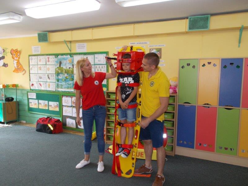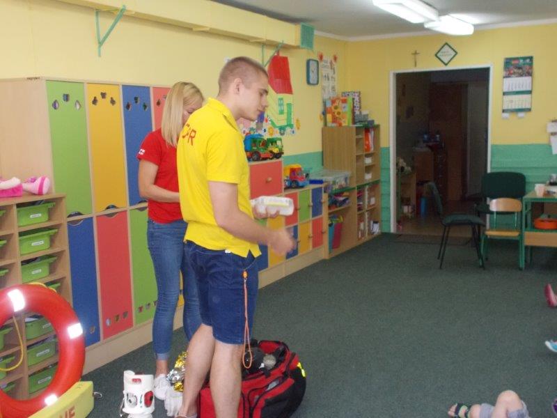 Na początku Pan Eryk i Pani Żaneta przedstawili podstawowe zasady obowiązujące podczas pływania w kąpieliskach: nie wolno kąpać się bez zgody i opieki dorosłych, nie wolno wchodzić do wody bezpośrednio po jedzeniu oraz po długim pobycie na słońcu. Ponadto z pomocą ratowników dzieci przypomniały sobie numery alarmowe. Następnie ratownicy przeszli do zaprezentowania sprzętu ratowniczego, z którego korzystają w swojej pracy. Oglądanie sprzętu połączone z informacjami na temat jego zastosowania i przeznaczenia sprawiły dzieciom ogromną przyjemność i jednocześnie było przekazem ogromnej wiedzy naszym dzieciom. Pani Żaneta i Pan Eryk pokazali takie sprzęty jak np.: koło ratunkowe, boję SP inaczej nazywaną „pamelką”, rzutkę rękawową, rzutkę siatkową, pas ratowniczy „Węgorz”, deskę ortopedyczną, a także całe wyposażenie apteczki. Nasi goście podczas prezentacji sprzętu zaprosili do współpracy kilkoro dzieci, które zostały przez nich umieszczone na desce ortopedycznej. Była to atrakcja nie tylko dla uczestników pokazu, ale wszystkich dzieci, dopingujących swoich kolegów. Ostatnimi punktami zajęć było zaprezentowanie przedszkolakom schematu postępowania przy udzielaniu pierwszej pomocy, a także sposobu ułożenia poszkodowanego w pozycji bocznej bezpiecznej.