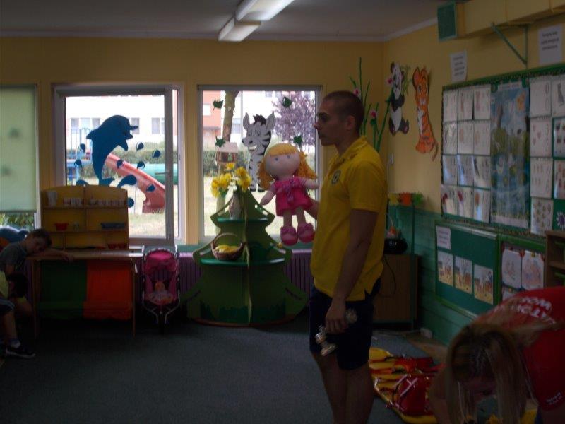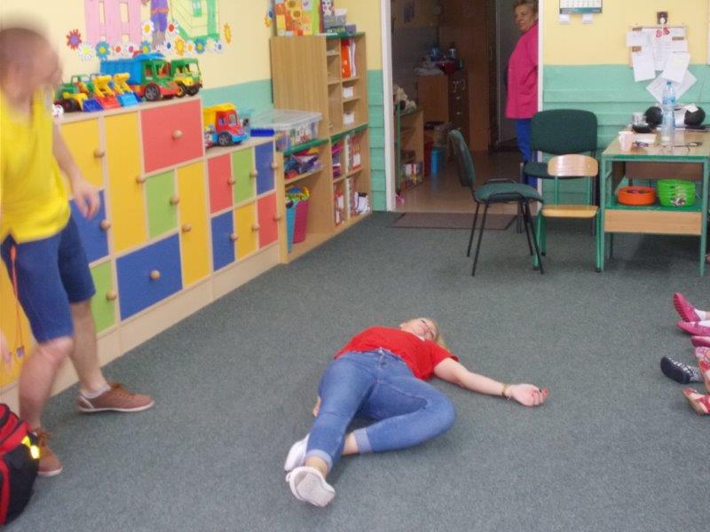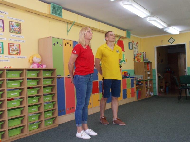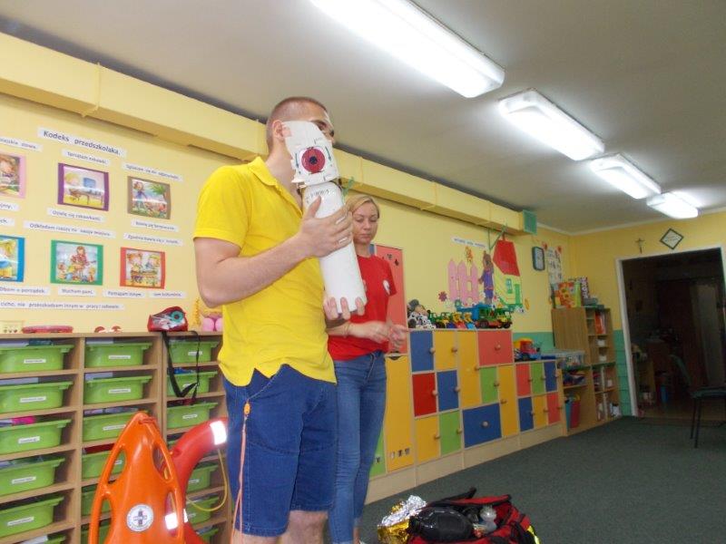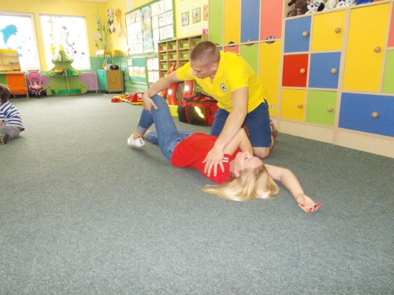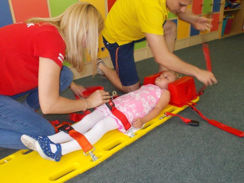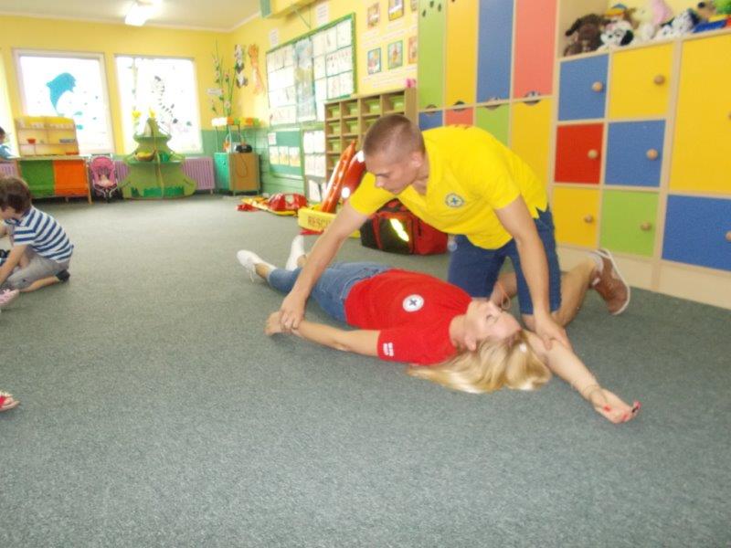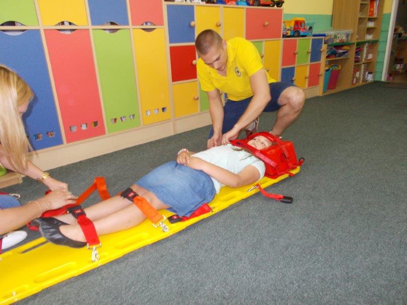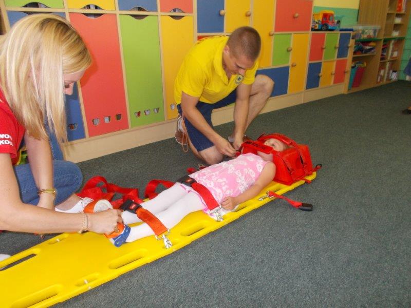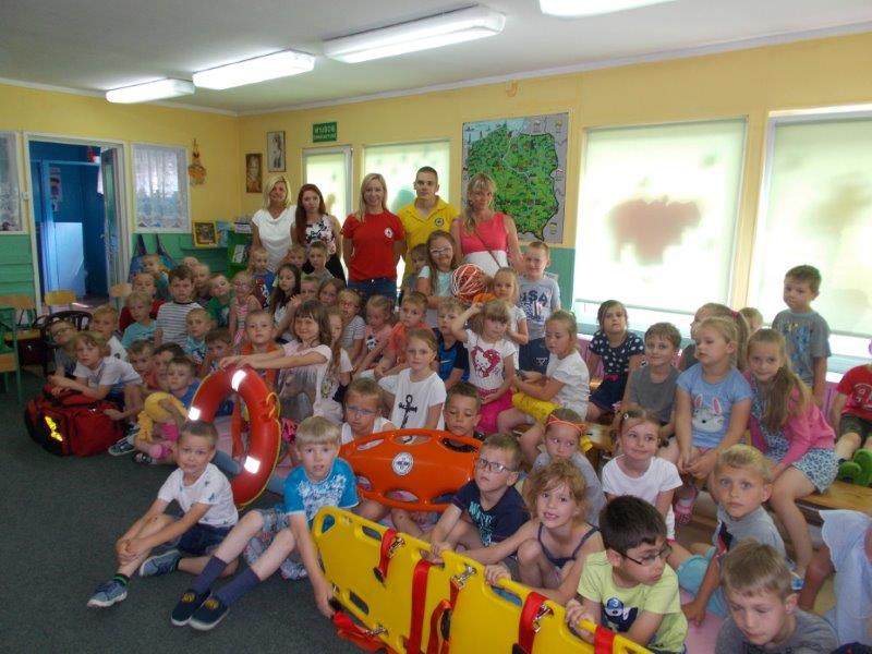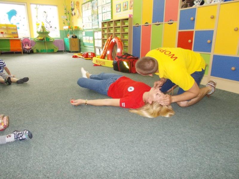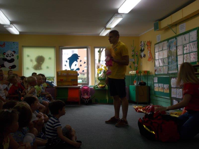Na początku Pan Eryk i Pani Żaneta przedstawili podstawowe zasady obowiązujące podczas pływania w kąpieliskach: nie wolno kąpać się bez zgody i opieki dorosłych, nie wolno wchodzić do wody bezpośrednio po jedzeniu oraz po długim pobycie na słońcu. Ponadto z pomocą ratowników dzieci przypomniały sobie numery alarmowe. Następnie ratownicy przeszli do zaprezentowania sprzętu ratowniczego, z którego korzystają w swojej pracy. Oglądanie sprzętu połączone z informacjami na temat jego zastosowania i przeznaczenia sprawiły dzieciom ogromną przyjemność i jednocześnie było przekazem ogromnej wiedzy naszym dzieciom. Pani Żaneta i Pan Eryk pokazali takie sprzęty jak np.: koło ratunkowe, boję SP inaczej nazywaną „pamelką”, rzutkę rękawową, rzutkę siatkową, pas ratowniczy „Węgorz”, deskę ortopedyczną, a także całe wyposażenie apteczki. Nasi goście podczas prezentacji sprzętu zaprosili do współpracy kilkoro dzieci, które zostały przez nich umieszczone na desce ortopedycznej. Była to atrakcja nie tylko dla uczestników pokazu, ale wszystkich dzieci, dopingujących swoich kolegów. Ostatnimi punktami zajęć było zaprezentowanie przedszkolakom schematu postępowania przy udzielaniu pierwszej pomocy, a także sposobu ułożenia poszkodowanego w pozycji bocznej bezpiecznej.