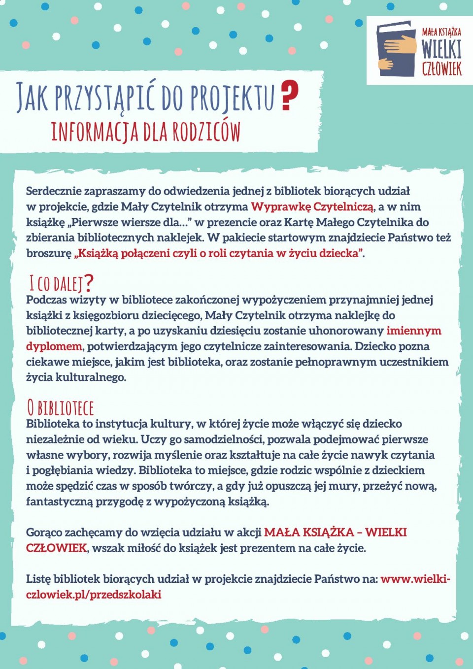 Kampania społeczna „Mała książka – wielki człowiek” przypomina o korzyściach wynikających ze wspólnego, rodzinnego czytania już od pierwszych miesięcy życia dziecka. Została przygotowana w związku z ogólnopolską akcją, w ramach której młodzi rodzice na oddziałach położniczych otrzymują wyjątkowe Wyprawki Czytelnicze: książkę z wierszami dla dzieci najwybitniejszych polskich poetów oraz broszurę informacyjną o roli czytania w rozwoju młodego człowieka. W 2017 r. w ramach akcji pilotażowej rozpoczętej w grudniu rozdaliśmy 100 tys. Wyprawek Czytelniczych w 360 szpitalach w całej Polsce, a w 2018 r. na nowo narodzone dzieci czeka aż 360 tys. wyprawek.
