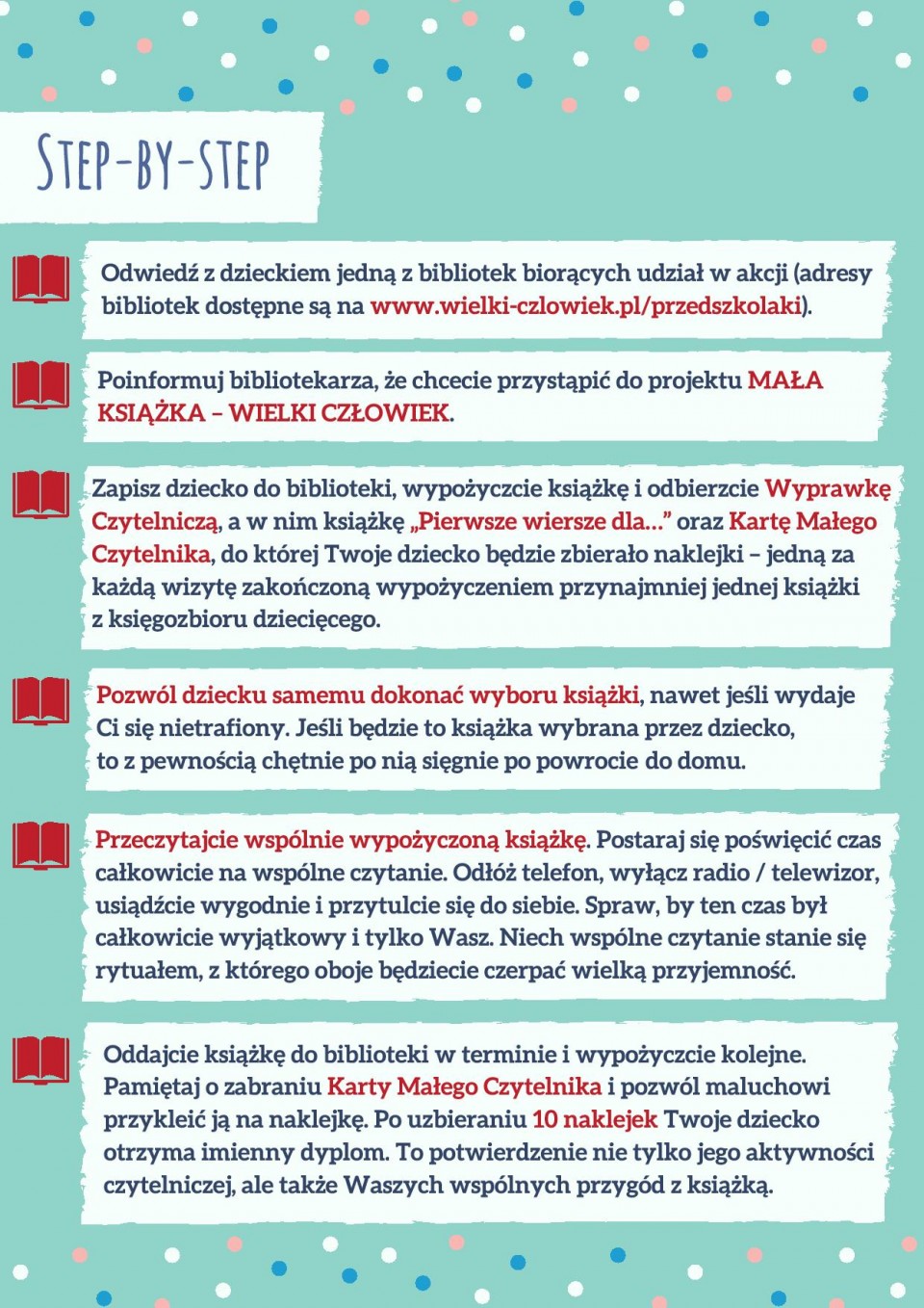 Każdy trzylatek, który przyjdzie do biblioteki, otrzyma w prezencie Wyprawkę Czytelniczą, a w niej: książkę „Pierwsze wiersze dla…” oraz Kartę Małego Czytelnika. Za każdą wizytę w bibliotece zakończoną wypożyczeniem minimum jednej książki z księgozbioru dziecięcego Mały Czytelnik otrzyma naklejkę, a po zebraniu dziesięciu zostanie uhonorowany imiennym dyplomem potwierdzającym jego czytelnicze zainteresowania. W Wyprawce znajdą coś dla siebie także rodzice. „Książką połączeni, czyli o roli czytania w życiu dziecka” to broszura informacyjna, przypominająca o korzyściach wynikających z czytania dzieciom oraz podpowiadająca, skąd czerpać nowe inspiracje czytelnicze. Dzięki akcji dziecko pozna ważne miejsce na czytelniczej mapie dzieciństwa (bibliotekę) i zostanie pełnoprawnym uczestnikiem życia kulturalnego.