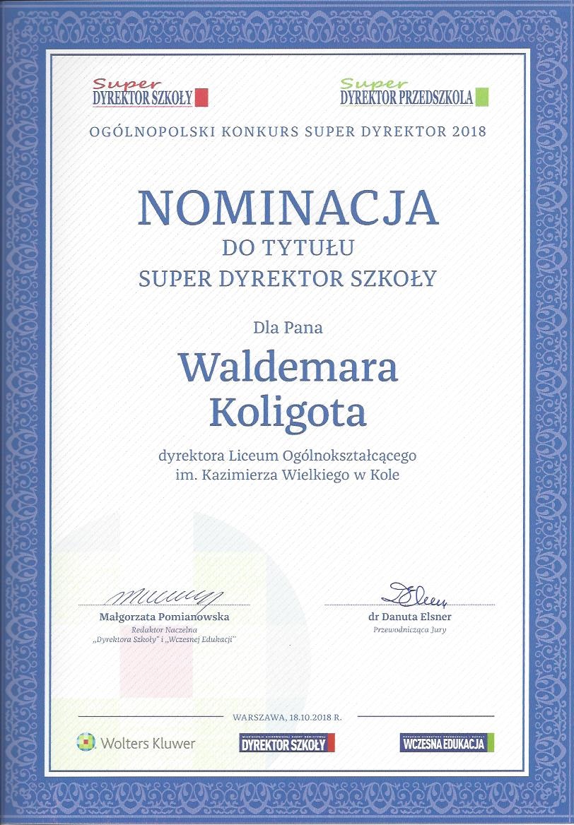 W tym roku w grupie nominowanych osób znalazł się dyrektor Waldemar Koligot. Na gali finałowej otrzymał wysokie wyróżnienie od Kapituły konkursowej tym samym docenione zostały innowacyjne działania jakie podejmuje szkoła i cała jej społeczność.