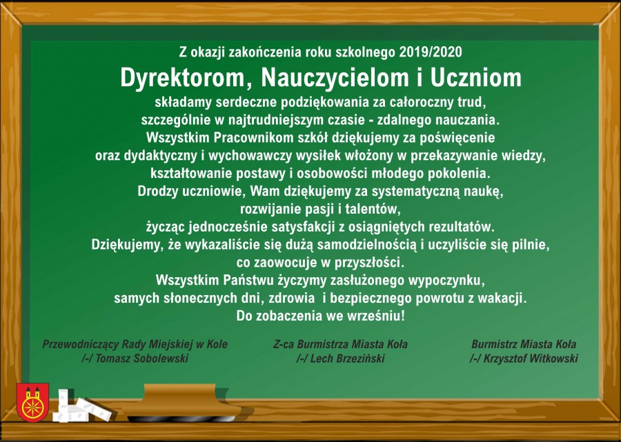 Z okazji zakończenia roku szkolnego 2019/2020 Dyrektorom, Nauczycielom i Uczniom składamy serdeczne podziękowania za